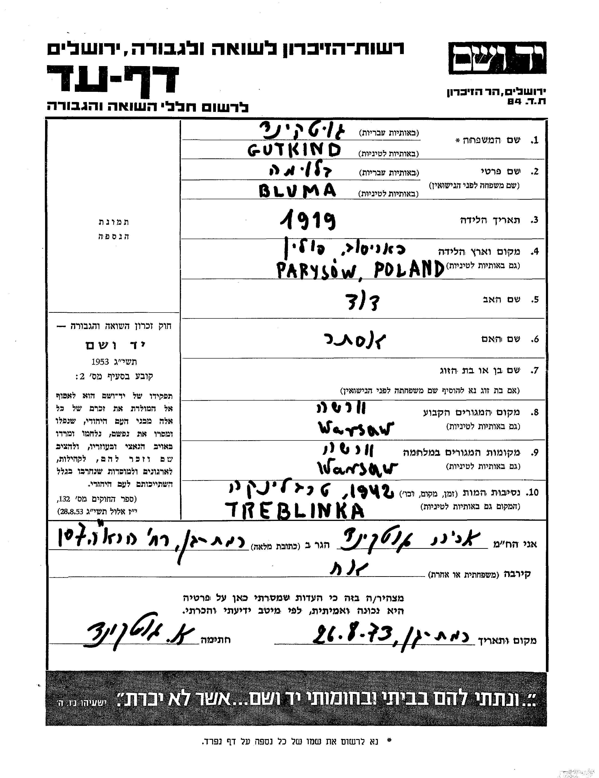 Gutkind Bluma 1919 Warsaw, Poland Page of Testimony