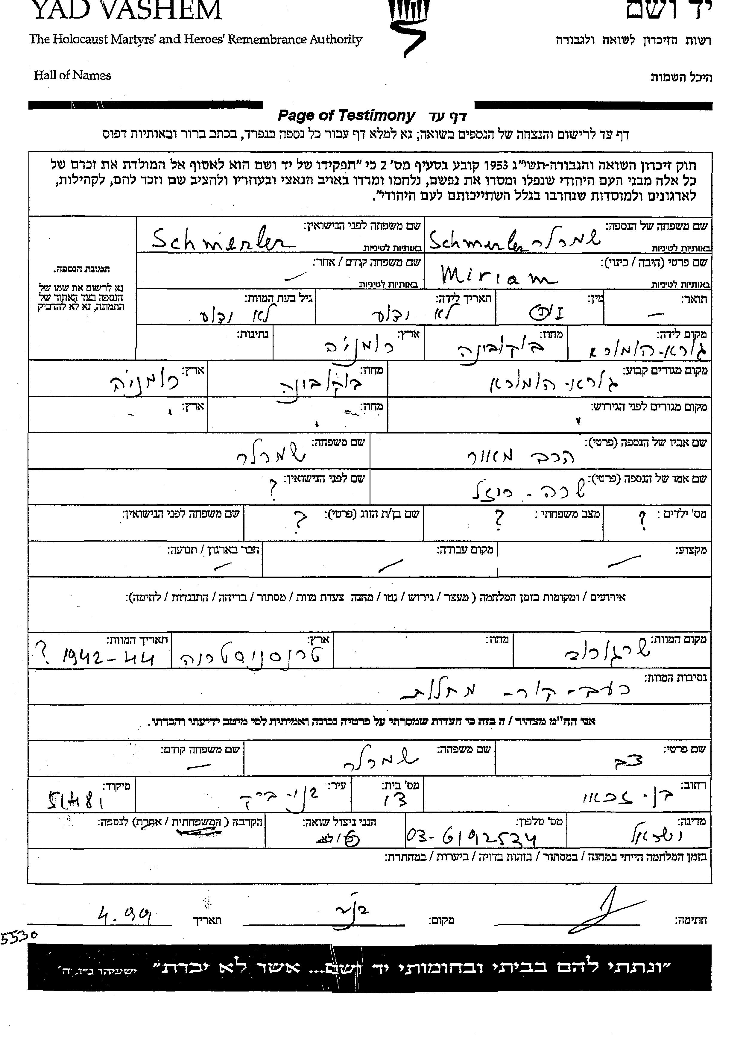 | Schmerler | Maryem Schlomcia | 1912 | Gura Humora, Romania | Page of Testimony |