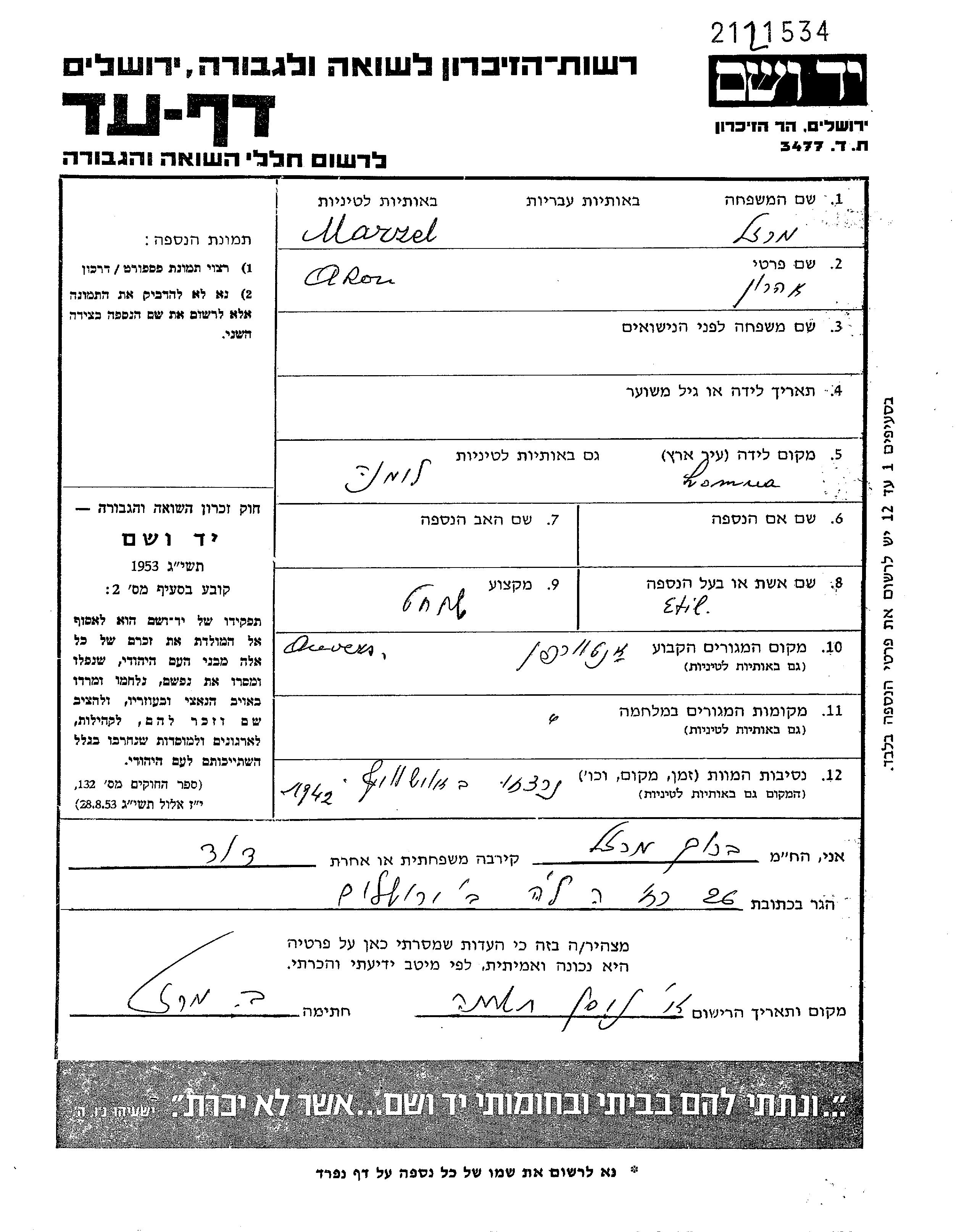 Aron Marzel was born in Lomna, Poland, 1893. He was a ritual slaughterer. Prior to WWII he lived in Antwerpen, Belgium. Aron was murdered in the Shoah. Place of death: Auschwitz, Poland, 1942.