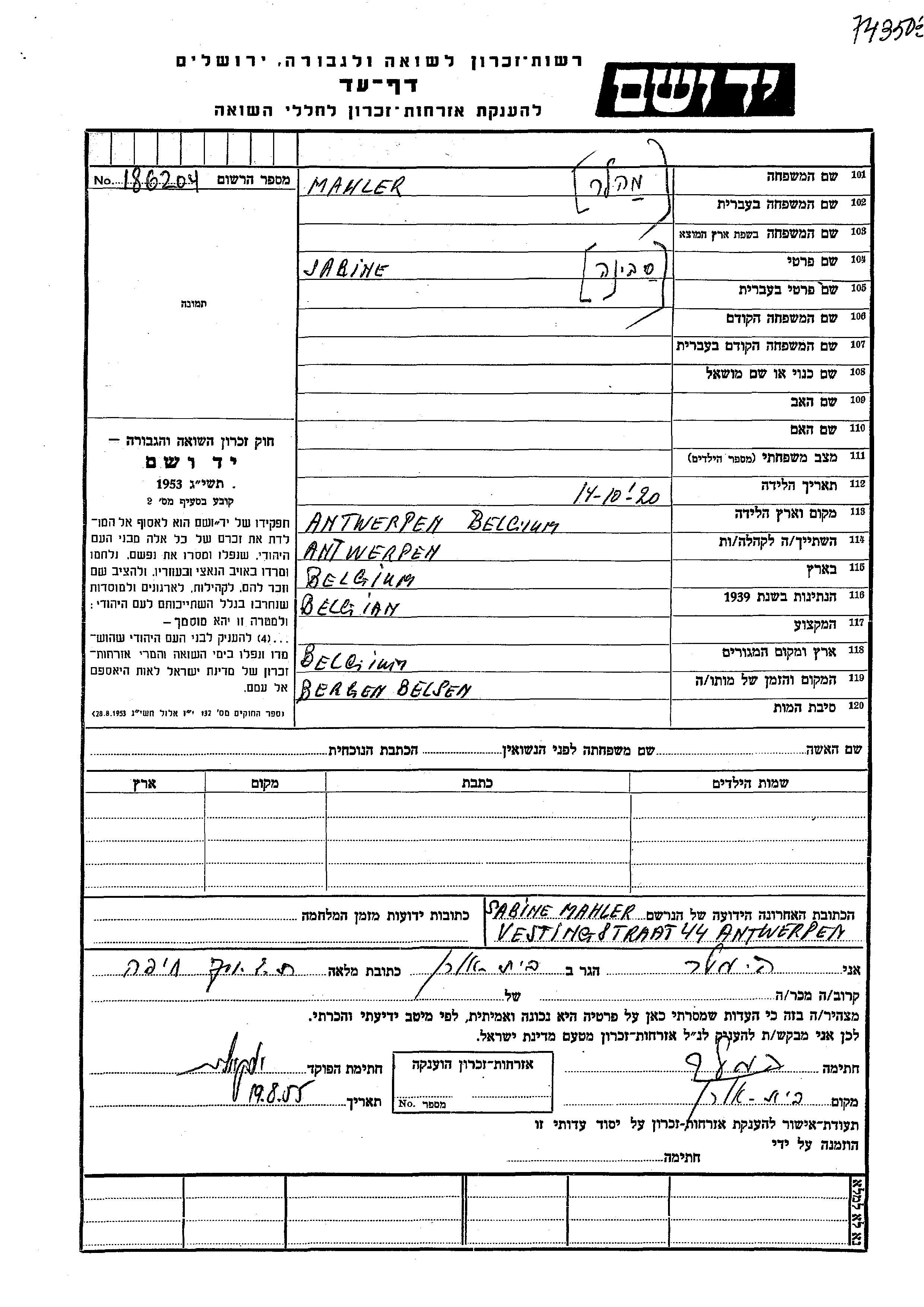 Sabine Mahler was born in Antwerpen, Belgium, 1920. She was a without profession. Prior to WWII she lived in Antwerpen, Belgium. Sabine was murdered in the Shoah. Place of death: Bergen Belsen, Germany.