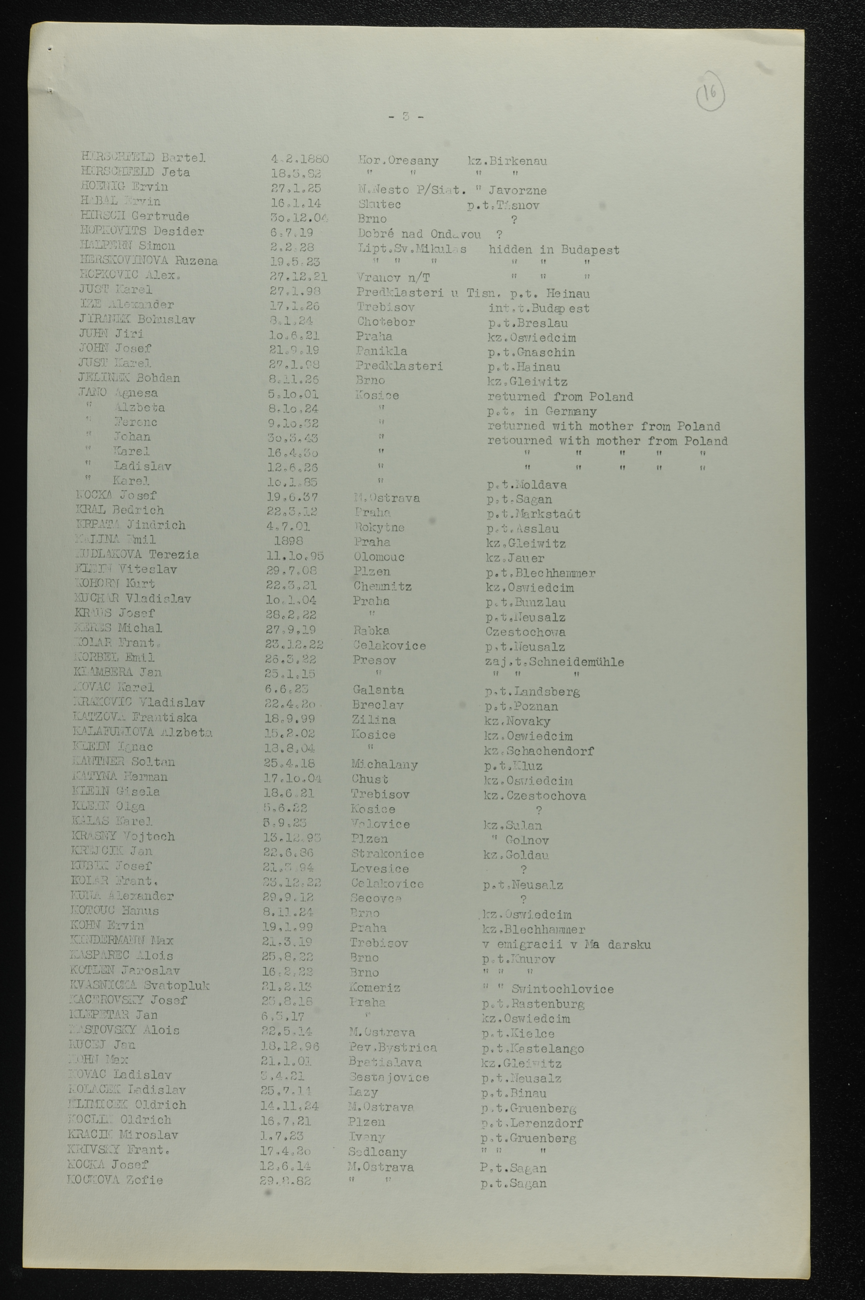 | Kolar | F | 1922 | Celakovice, Czechoslovakia | List of persecuted persons |