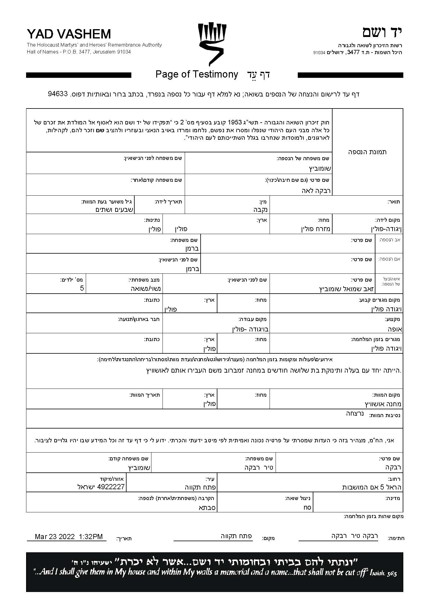 Rivka Lea Shumovitz nee Berman was born in Wygoda, Poland. She was a baker and married to Zeev Shmuel. Prior to WWII she lived in Wygoda, Poland. During the war she was in Auschwitz, Poland. Rivka Lea was murdered in the Shoah. Place of death: Auschwitz, Poland.