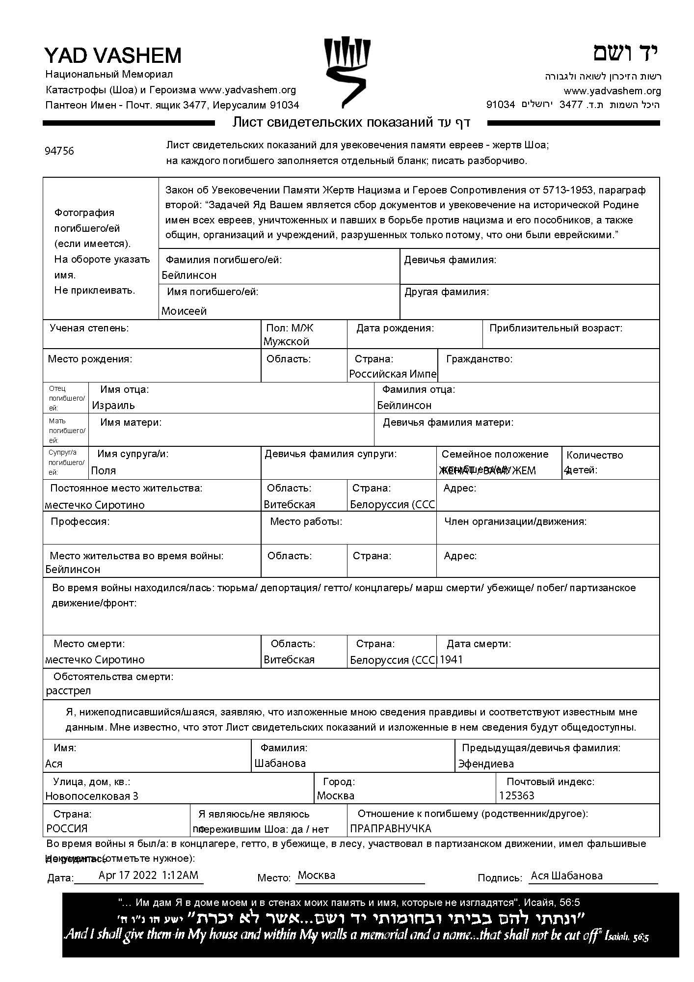 Beylinson Moisey Sirotino, Belorussia (USSR) Page of Testimony (digital)