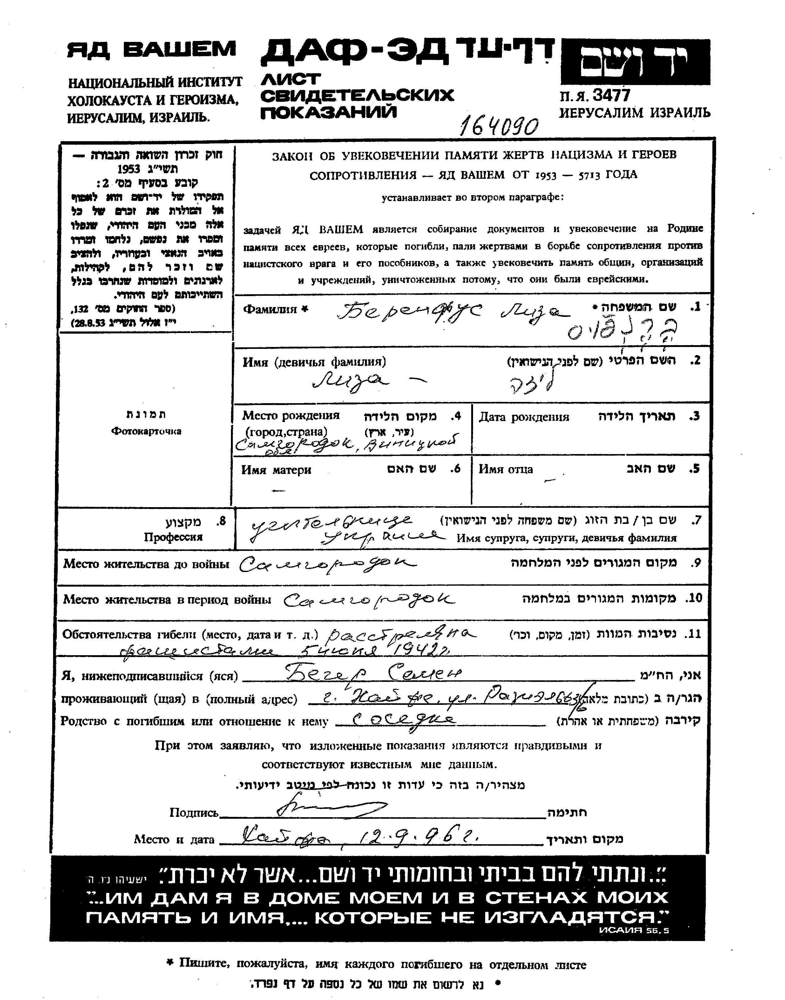 Liza Berenfus was born in Samgorodok, Ukraine (USSR). She was a teacher. Prior to WWII she lived in Samgorodok, Ukraine (USSR). During the war she was in Samgorodok, Ukraine (USSR). Liza was murdered in the Shoah. Place of death: unknown, 05/06/1942.