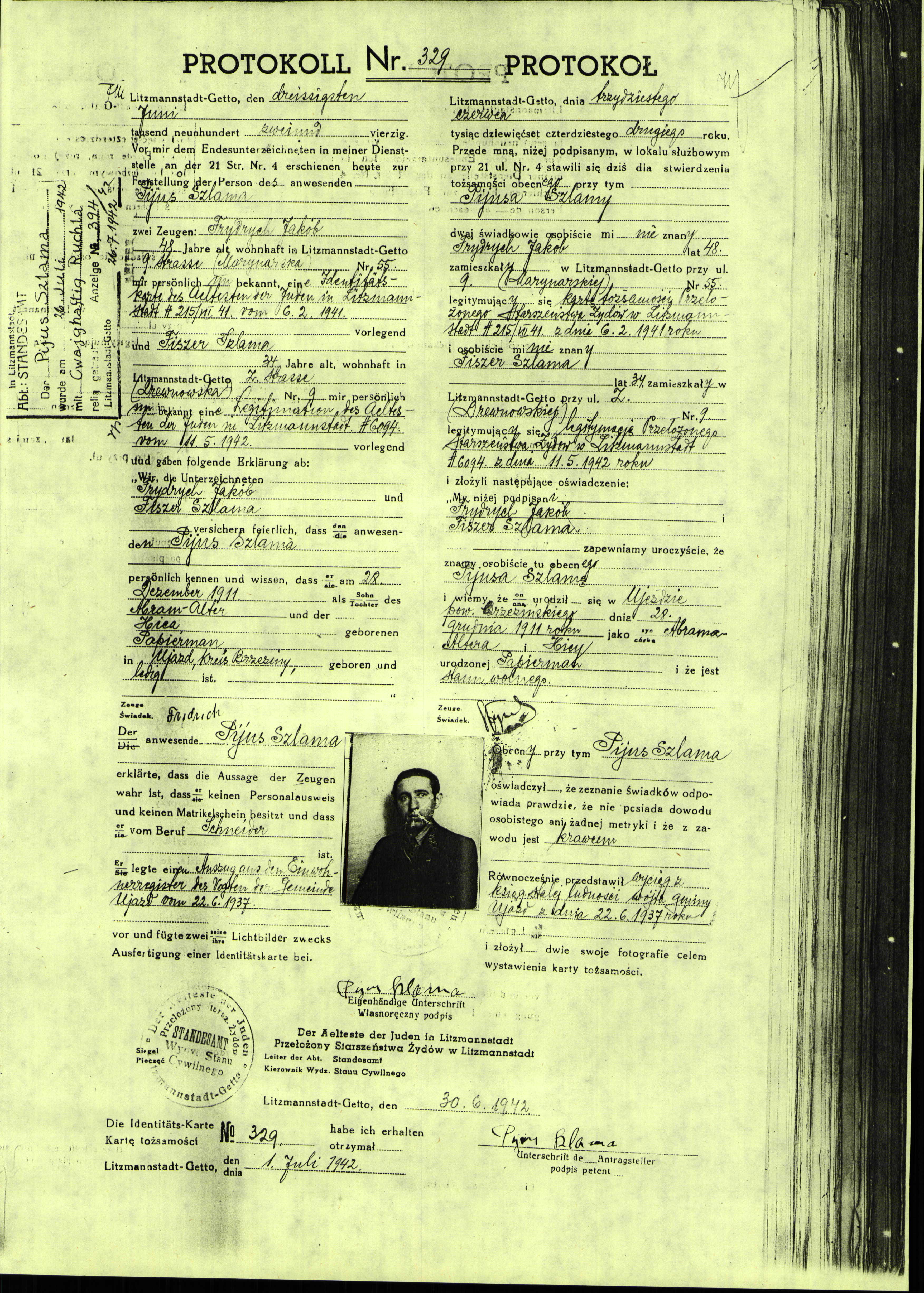 Szlama Pijus was born in Ujazd, Poland, 1911 to Abram Alter and Hica nee Papierman. He was a tailor and single. During the war he was in Lodz, Poland.