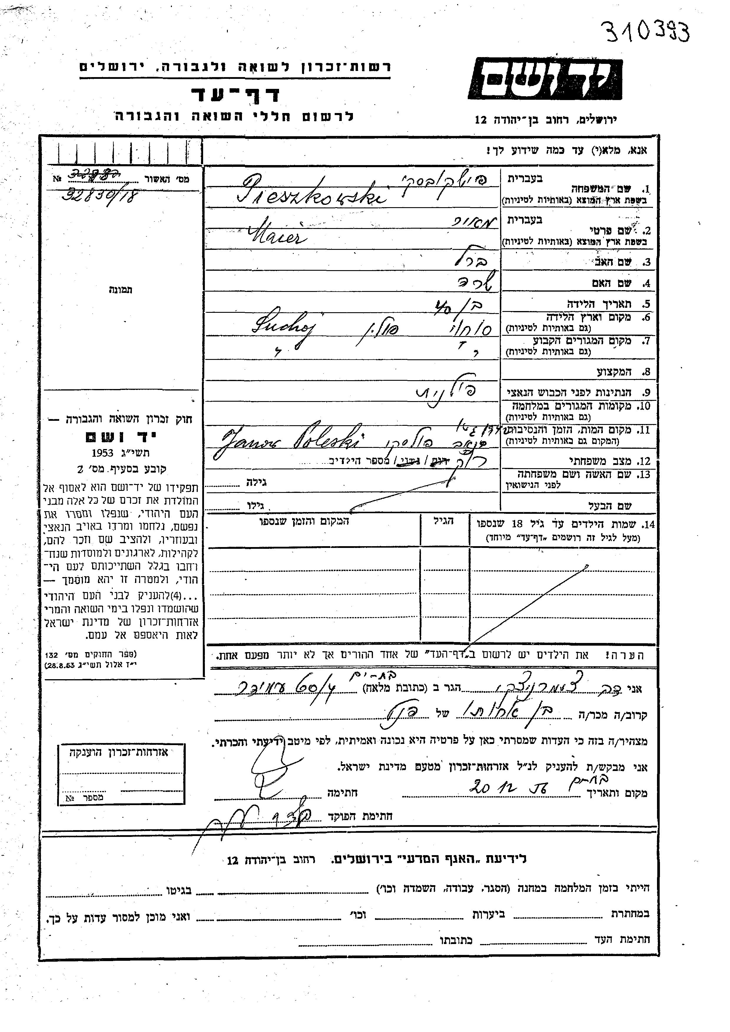 Maier Pieszkowski Fishkovski was born in Suchoj, Poland to Berl and Sara. He was single. Prior to WWII he lived in Suchoj, Poland. During the war he was in Poland. Maier was murdered in the Shoah. Place of death: Janow Poleski, Poland.