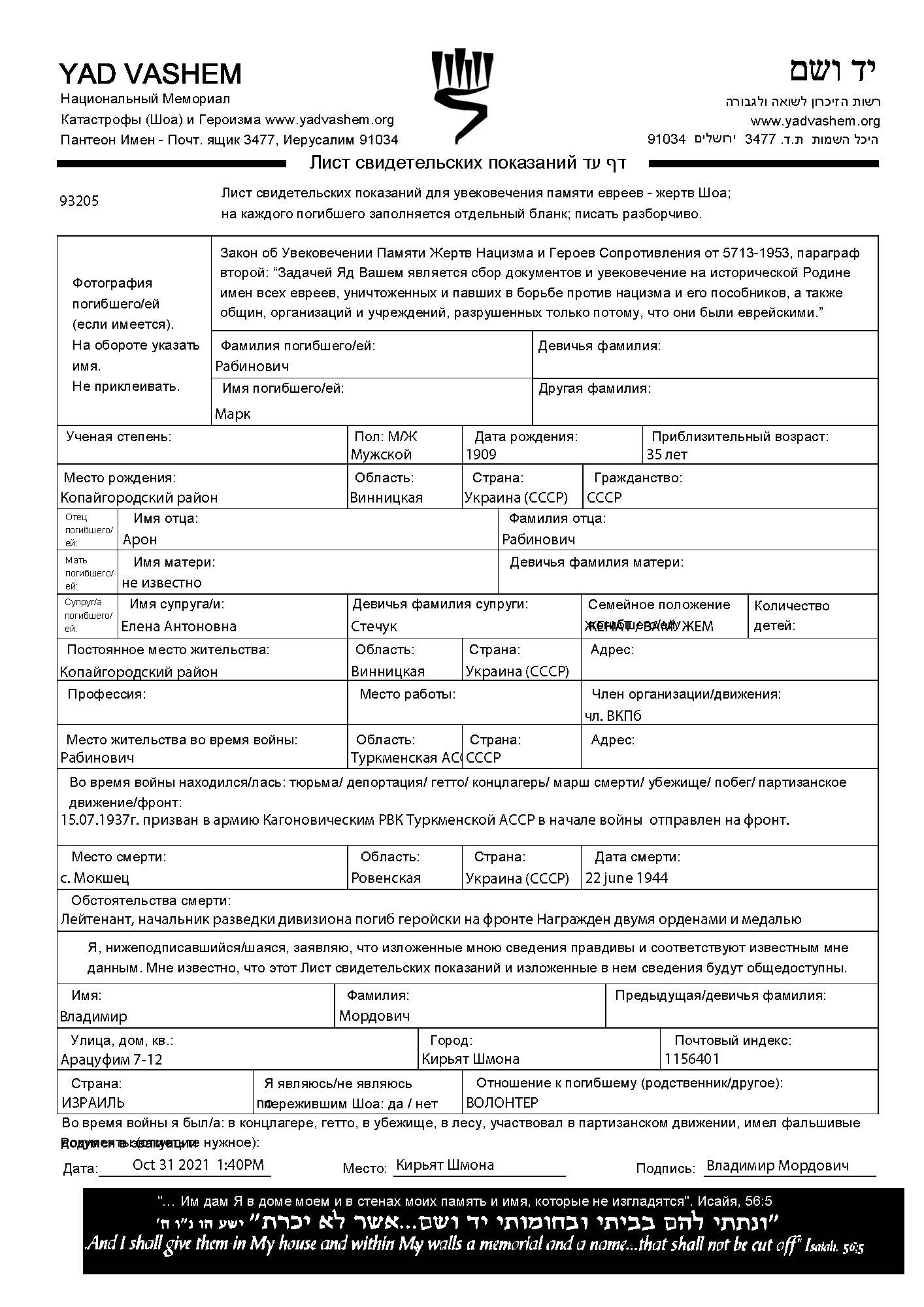 | Rabinovich | Mark | 1909 | Ukraine (USSR) | Page of Testimony (digital) |