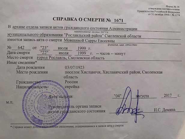 Sarra Movshina was born, 1923. She was an uchashchayasya. Prior to WWII she lived in Khislavichi, Russia (USSR). Sarra was registered following the evacuation/ in the interior of the Soviet Union.