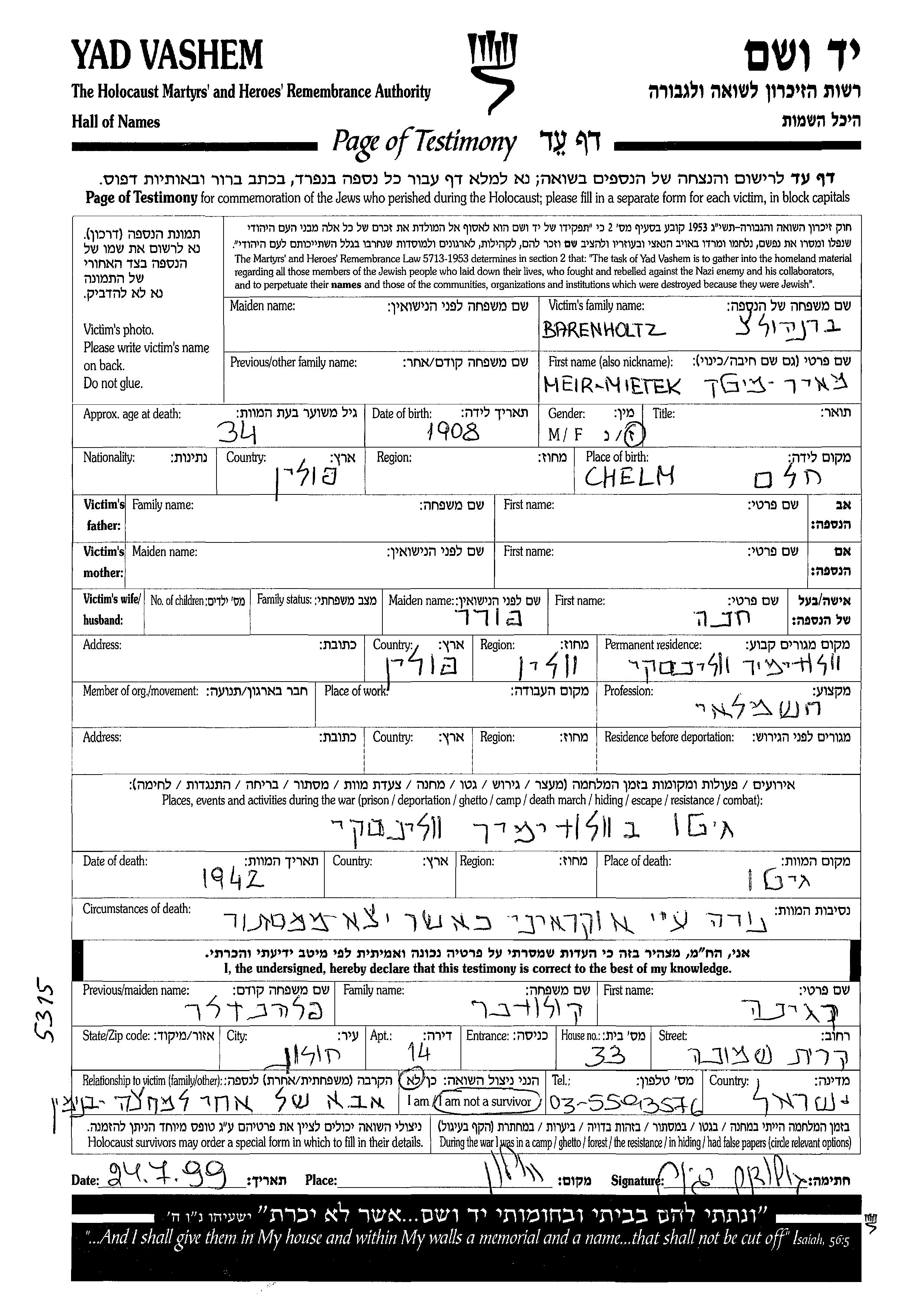 | Barenholc | Mejer Mietek | 1908 | Wlodzimierz Wolynski, Poland | Page of Testimony |