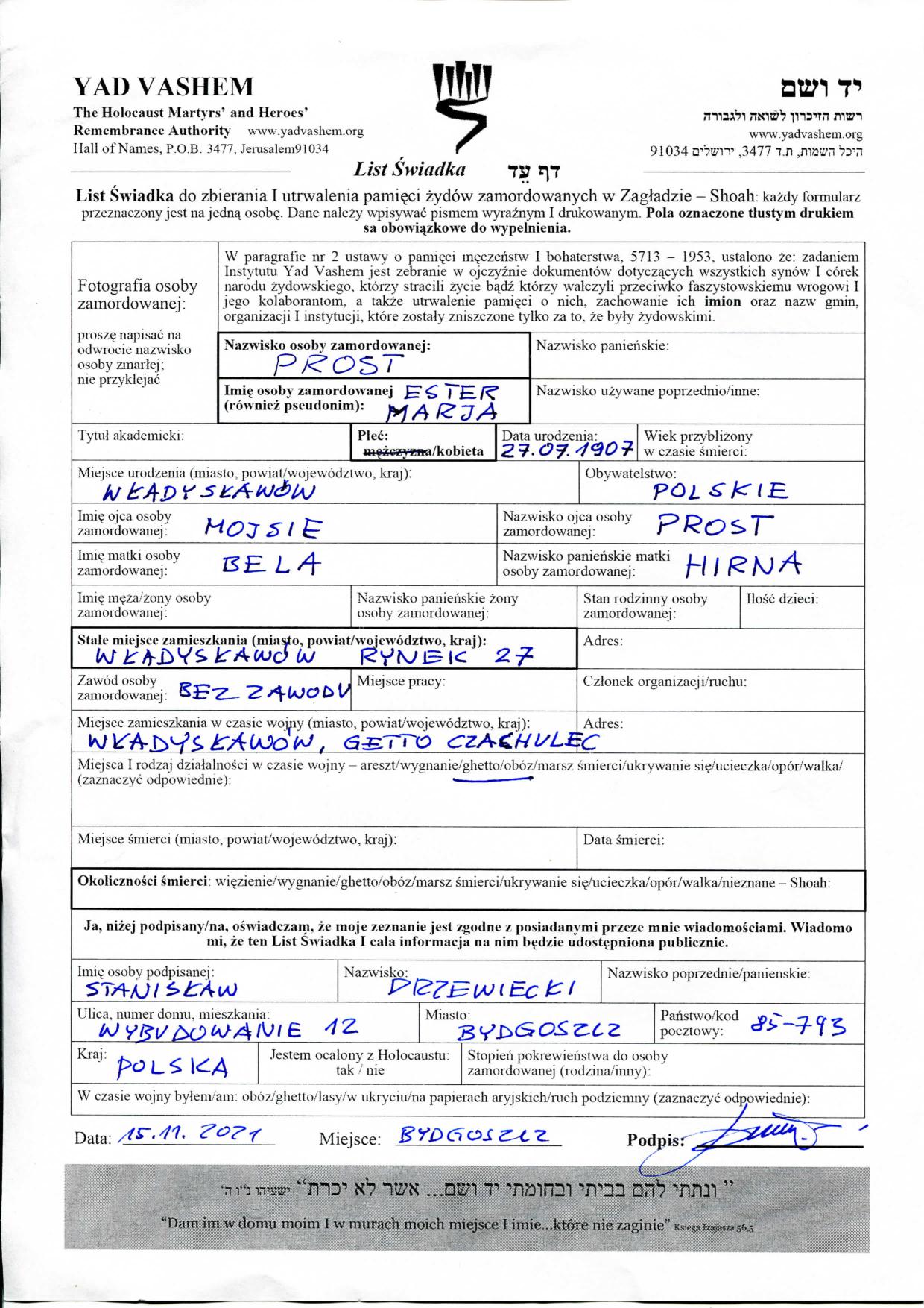 Prost Ester Marja 1907 Wladyslawow, Poland Questionnaire