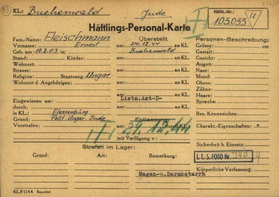 Fleischmann Ernő 1903 Szombathely, Hungary ITS card file
