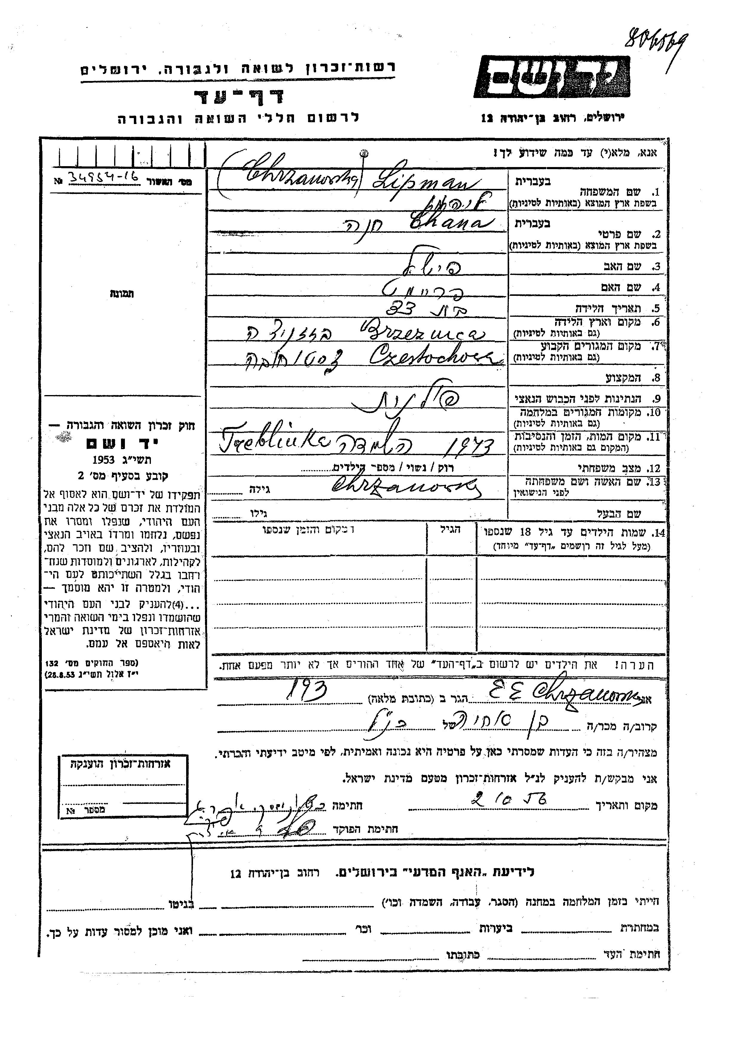 Chana Lipman nee Chrzanowski was born in Brzeznica, Poland to Fishel and Frimeta. Prior to WWII she lived in Czestochow, Poland. Chana was murdered in the Shoah. Place of death: Treblinka, Poland, 1943.