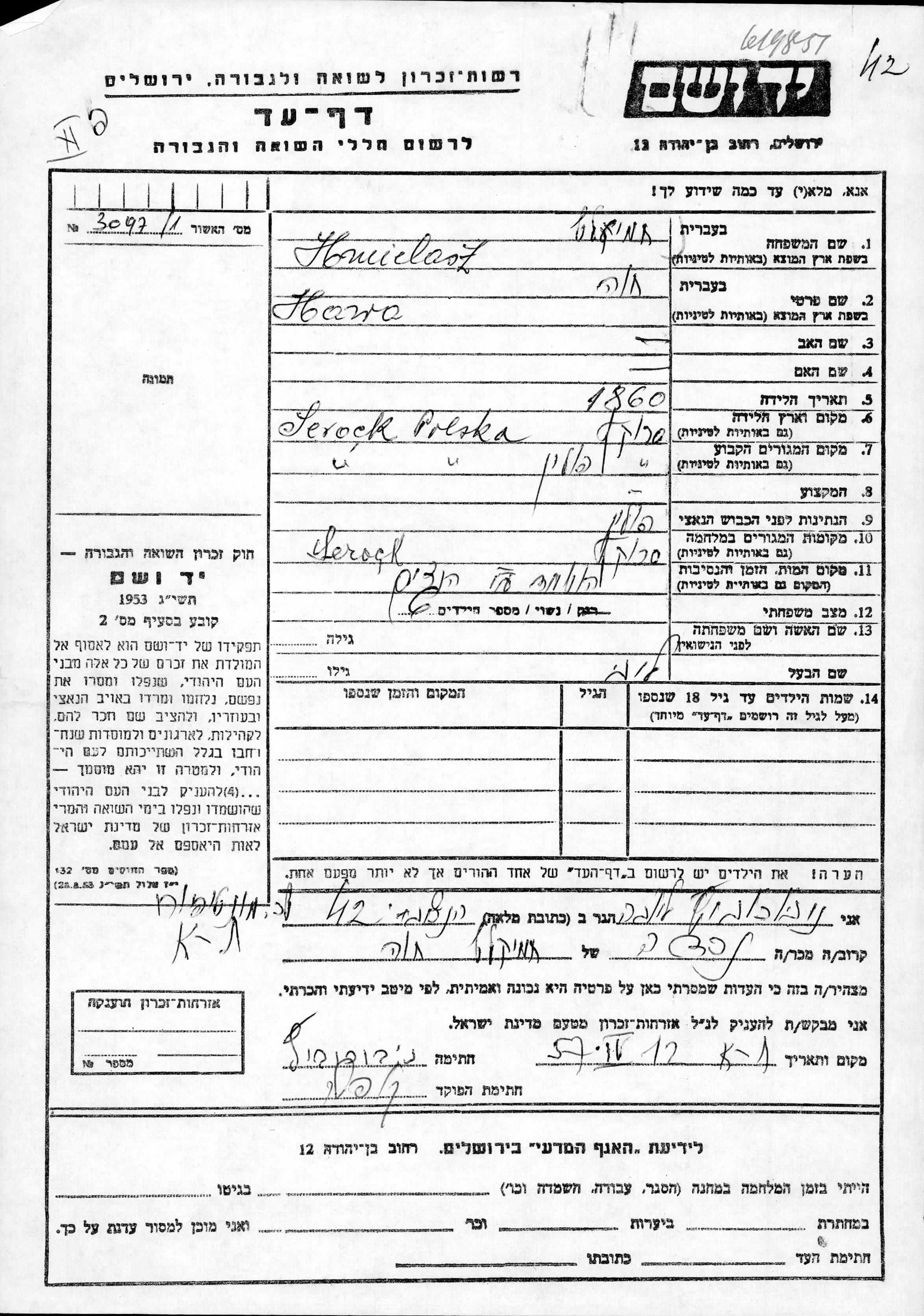 Hawa Hmielasz was born in Serock, Poland, 1860. She was married to Leib. Prior to WWII she lived in Serock, Poland. During the war she was in Serock, Poland. Hawa was murdered in the Shoah. Place of death: unstated place.