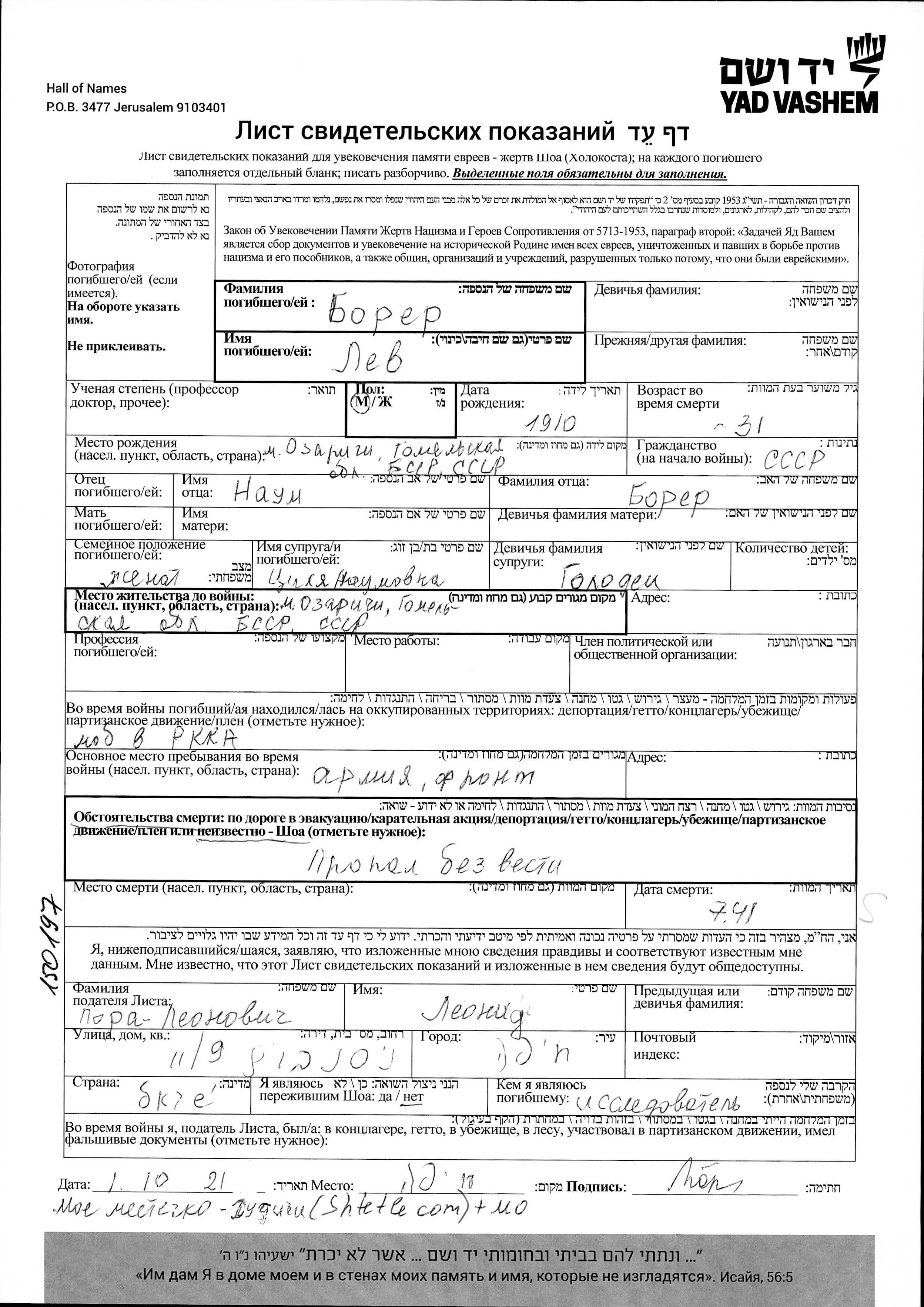 Lev Borer was born in Ozarichi, Belorussia (USSR), 1910 to Naum. He was married to Tzilya nee Golodetz. Prior to WWII he lived in Ozarichi, Belorussia (USSR). During the war he was in Ozarichi, Belorussia (USSR). Lev was murdered in the Shoah. Place of death: Soviet Union, 07/1941.