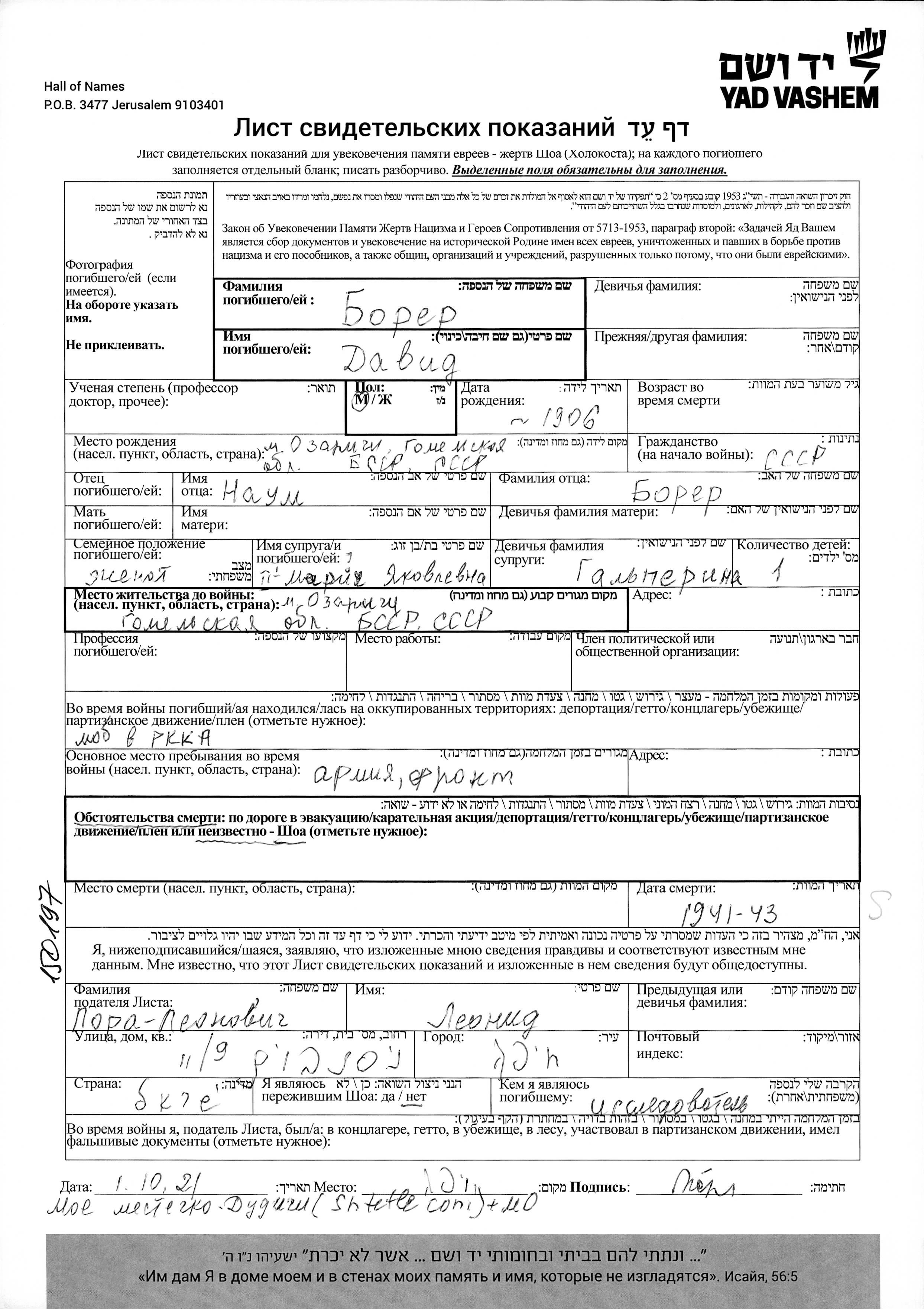 David Borer was born in Ozarichi, Belorussia (USSR), 1906 to Naum. He was married to Mariya nee Galperina. Prior to WWII he lived in Ozarichi, Belorussia (USSR). During the war he was in Ozarichi, Belorussia (USSR). David was killed in military service in WWII. Place of death: Soviet Union, 1941.