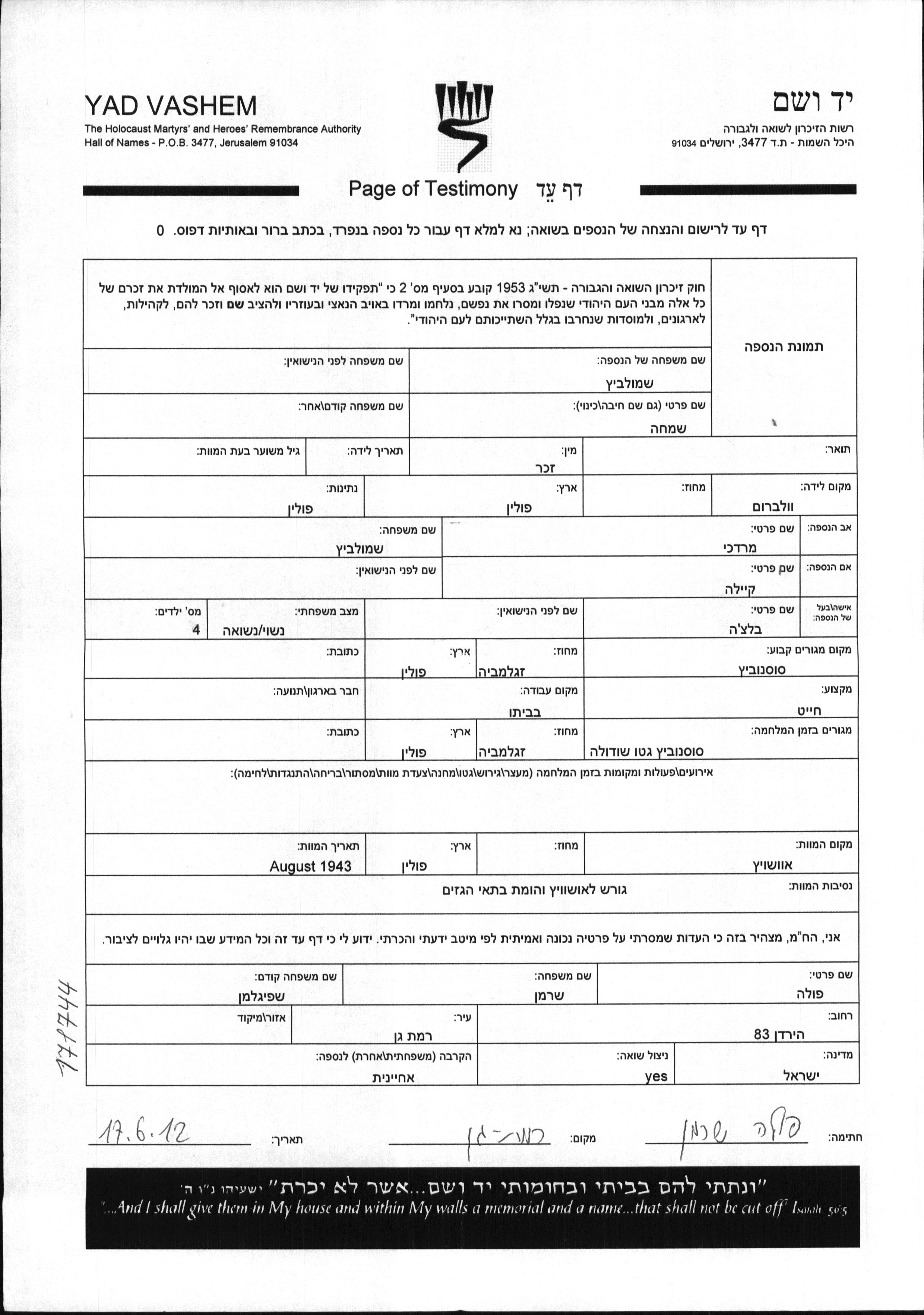 Shmulevitz Simkha Sosnowiec, Poland Page of Testimony (digital signed)