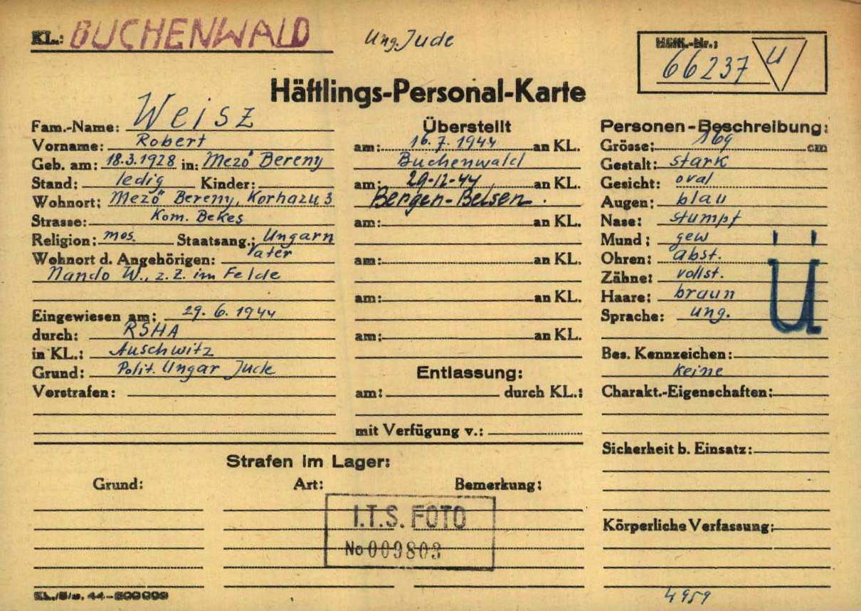 Weisz Robert 1928 Mezobereny, Hungary ITS card file