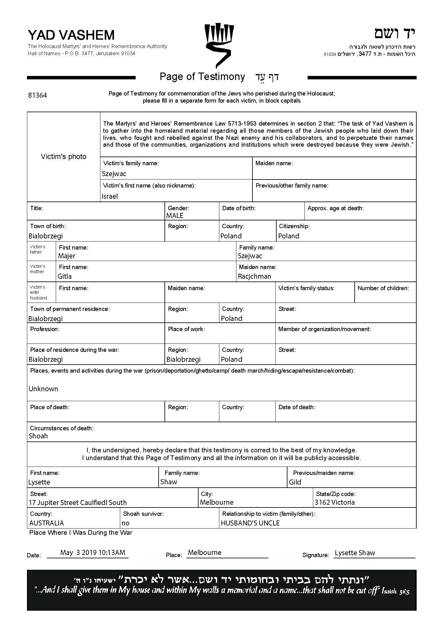Israel Szejwac was born in Bialobrzegi, Poland, 1924. He was a farm worker. Prior to WWII he lived in Bialobrzegi, Poland. Israel was murdered in the Shoah. Place of death: unstated place.