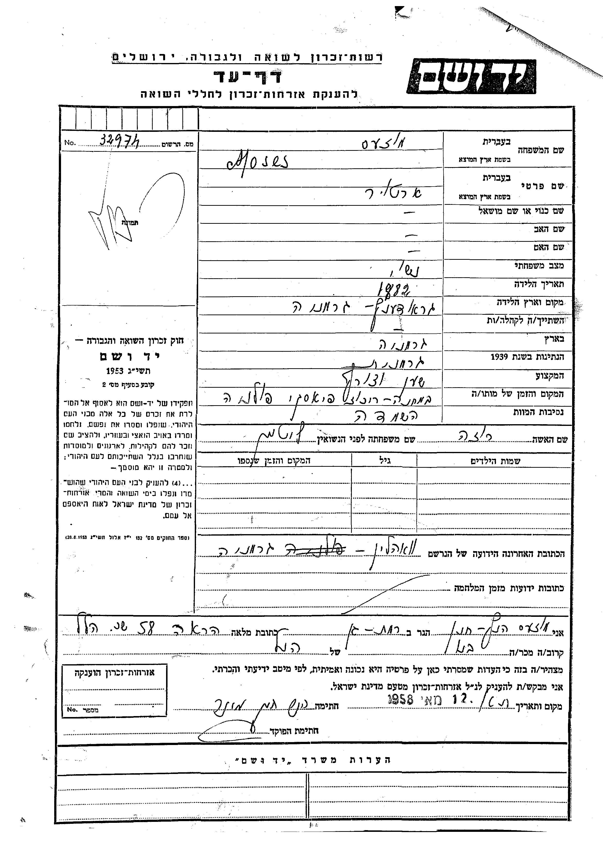 Artur Moses was born in Grudziadz, Poland, 1882. He was a watchmaker / silversmith and married to Roza nee Litman. During the war he was in Wolyn, Poland. Artur was murdered in the Shoah. Place of death: Piaski, Poland.