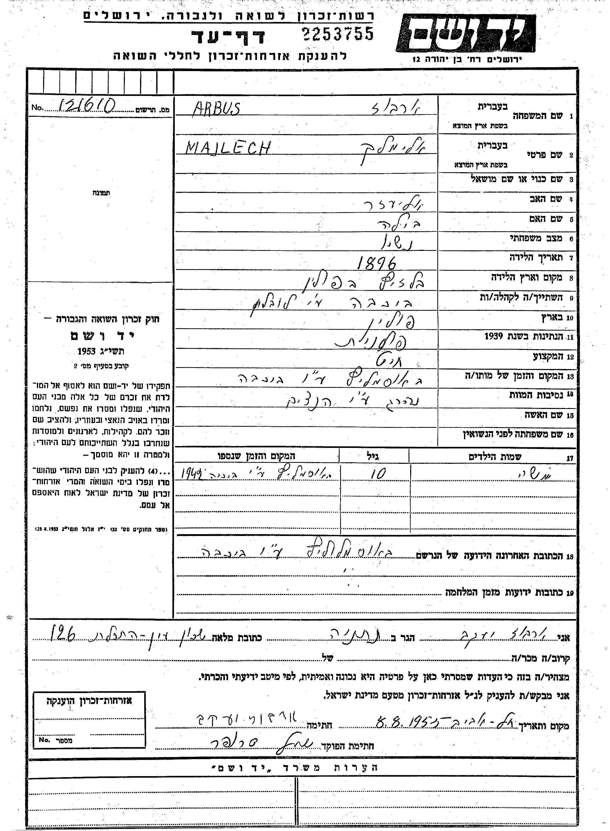 Meilekh Elimelekh Arbus was born in unstated place, 1896. He was a tailor. Prior to WWII he lived in Bychawa, Poland. Meilekh Elimelekh was murdered in the Shoah. Place of death: Osmolice, Poland.