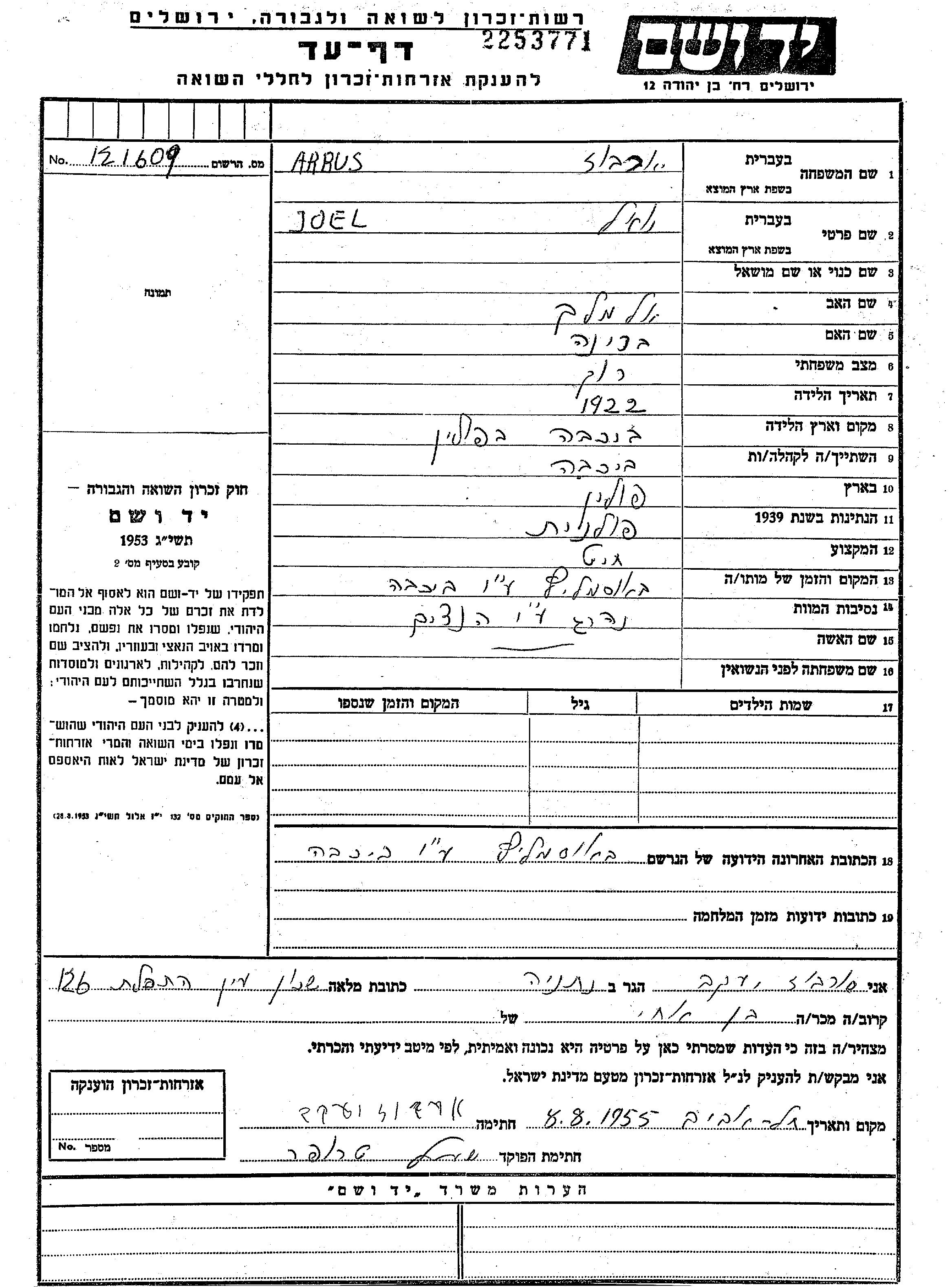 Arbus Yoel 1924 Osmolice, Poland Page of Testimony