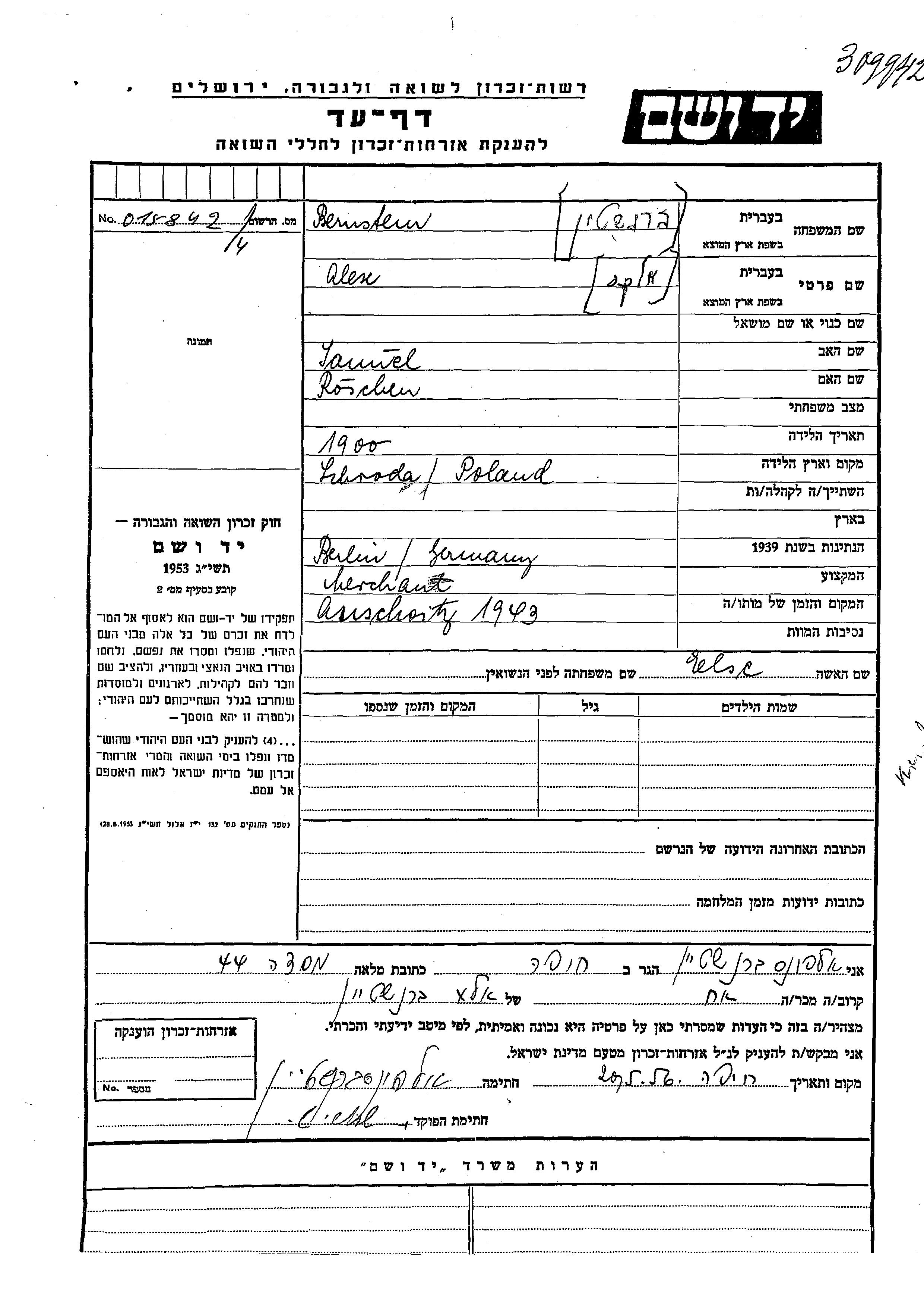 Aleks Bernstein was born in Sroda, Poland, 1900 to Samuel and Roschen. He was a merchant. Prior to WWII he lived in Berlin, Germany. Aleks was murdered in the Shoah. Place of death: Auschwitz, Poland, 1943.