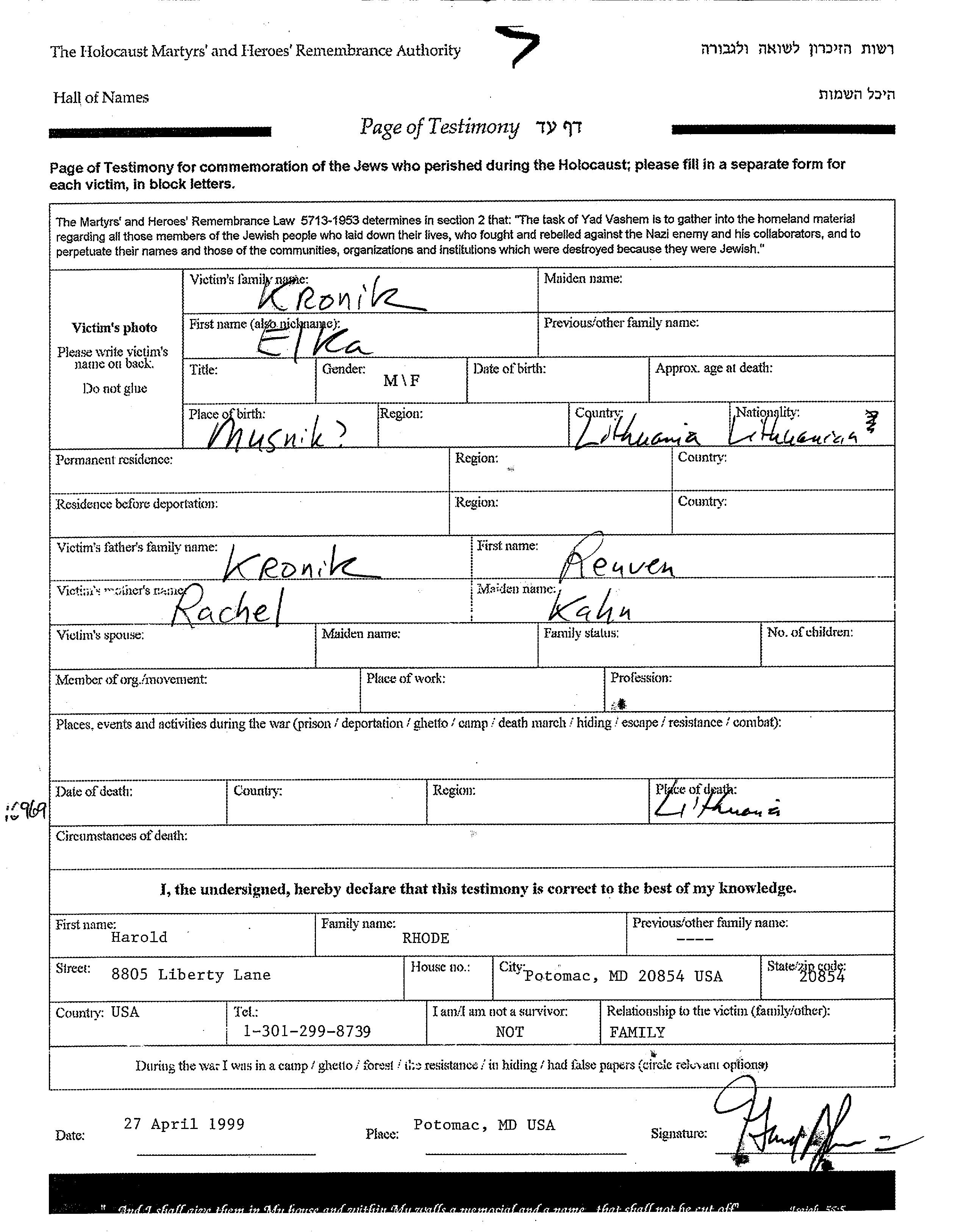 Yad Vashem - Pages of Testimony Names Memorial Collection