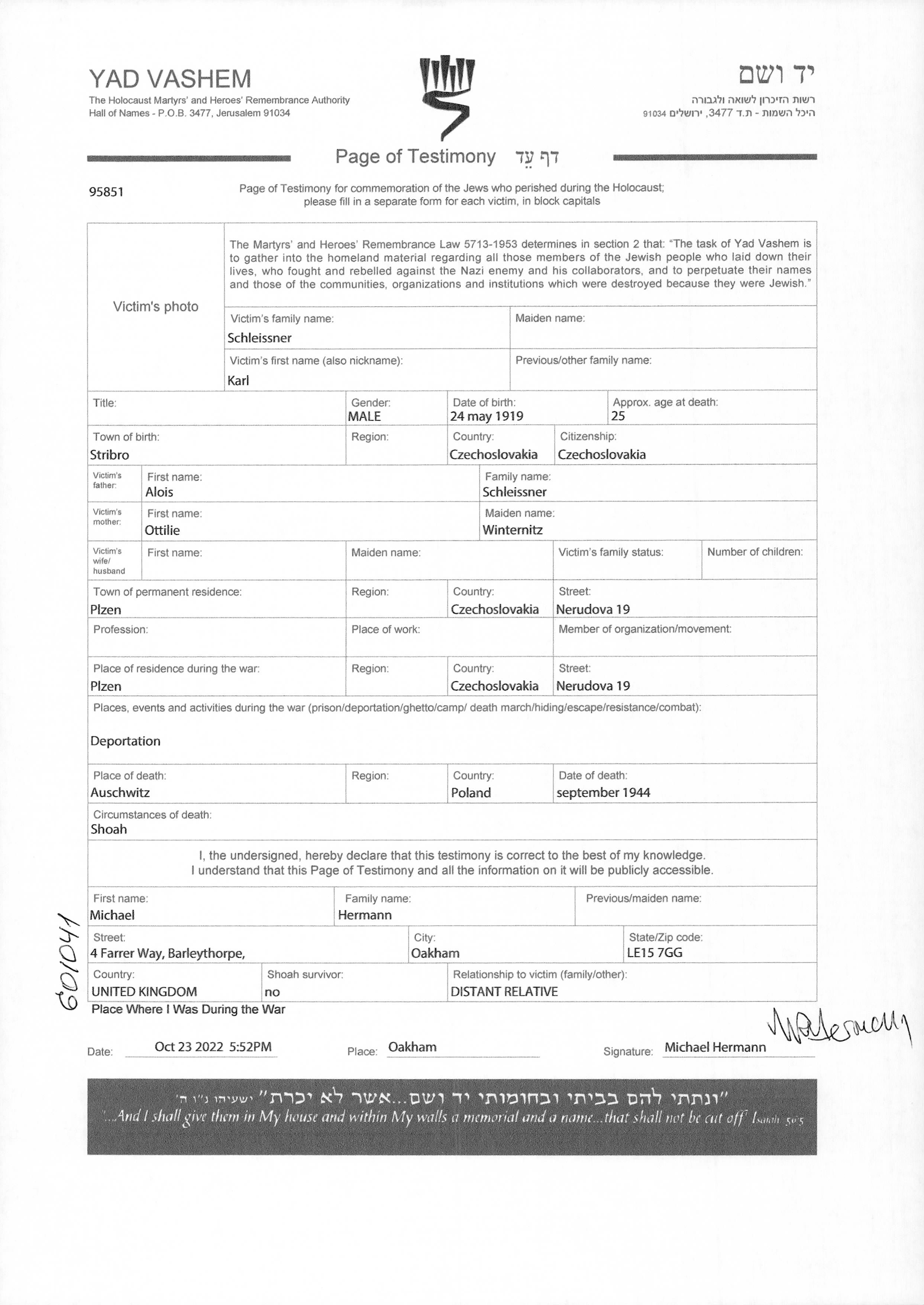 Schleissner Karl 1919 Plzen, Czechoslovakia Page of Testimony (digital signed)