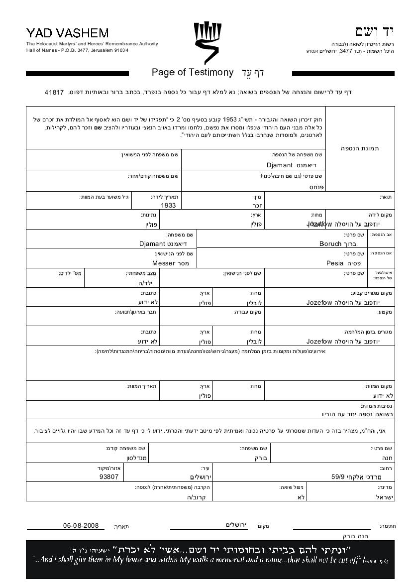 Djamant Pinkhas 1933 Jozefow, Poland Page of Testimony (digital)