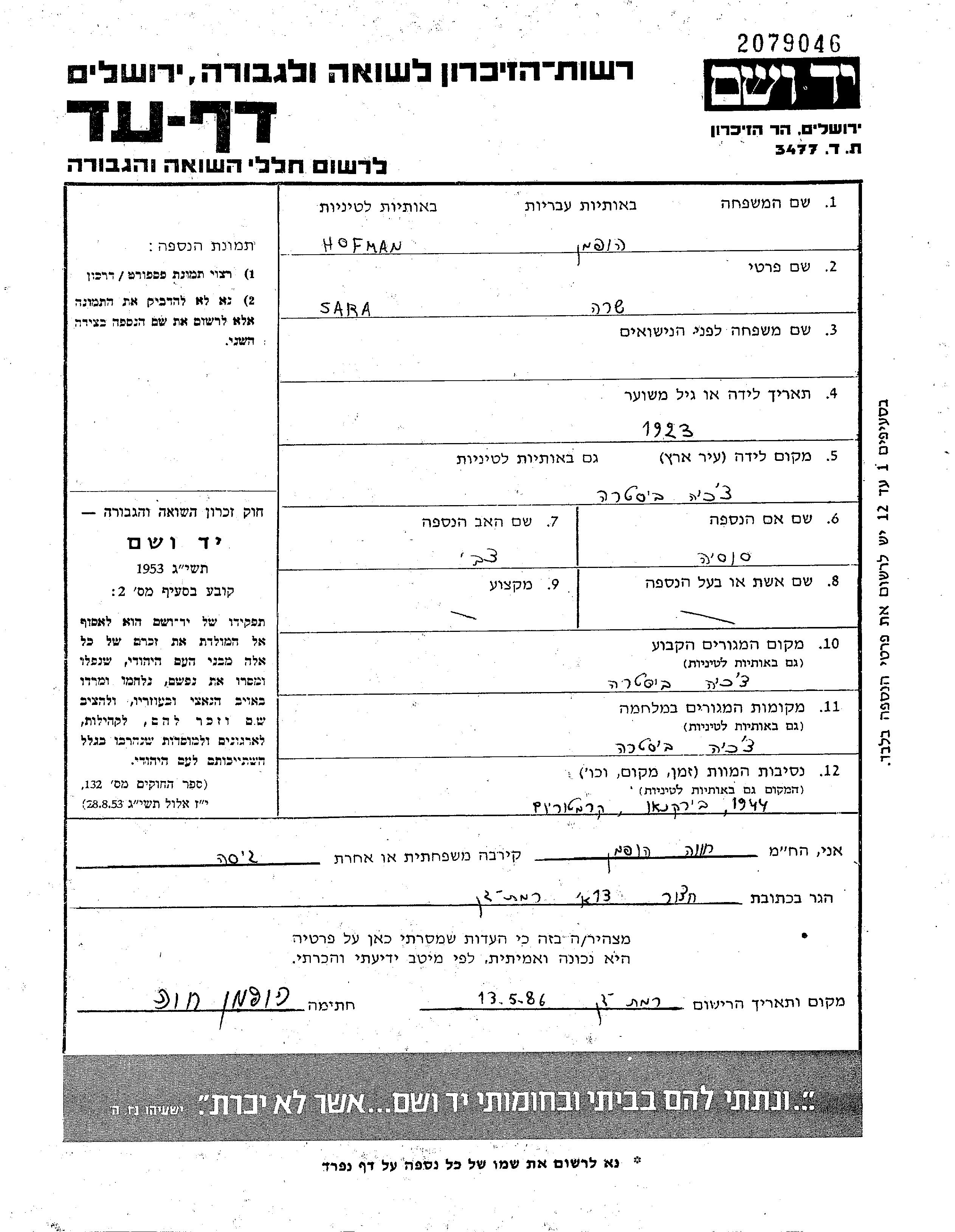 Sara Hofman was born in Bisztra, Czechoslovakia to Tzvi and Sosia nee Zisovich. She was single. Prior to WWII she lived in Bisztra, Czechoslovakia. During the war she was in Bisztra, Czechoslovakia. Sara was murdered in the Shoah. Place of death: Birkenau, Poland.