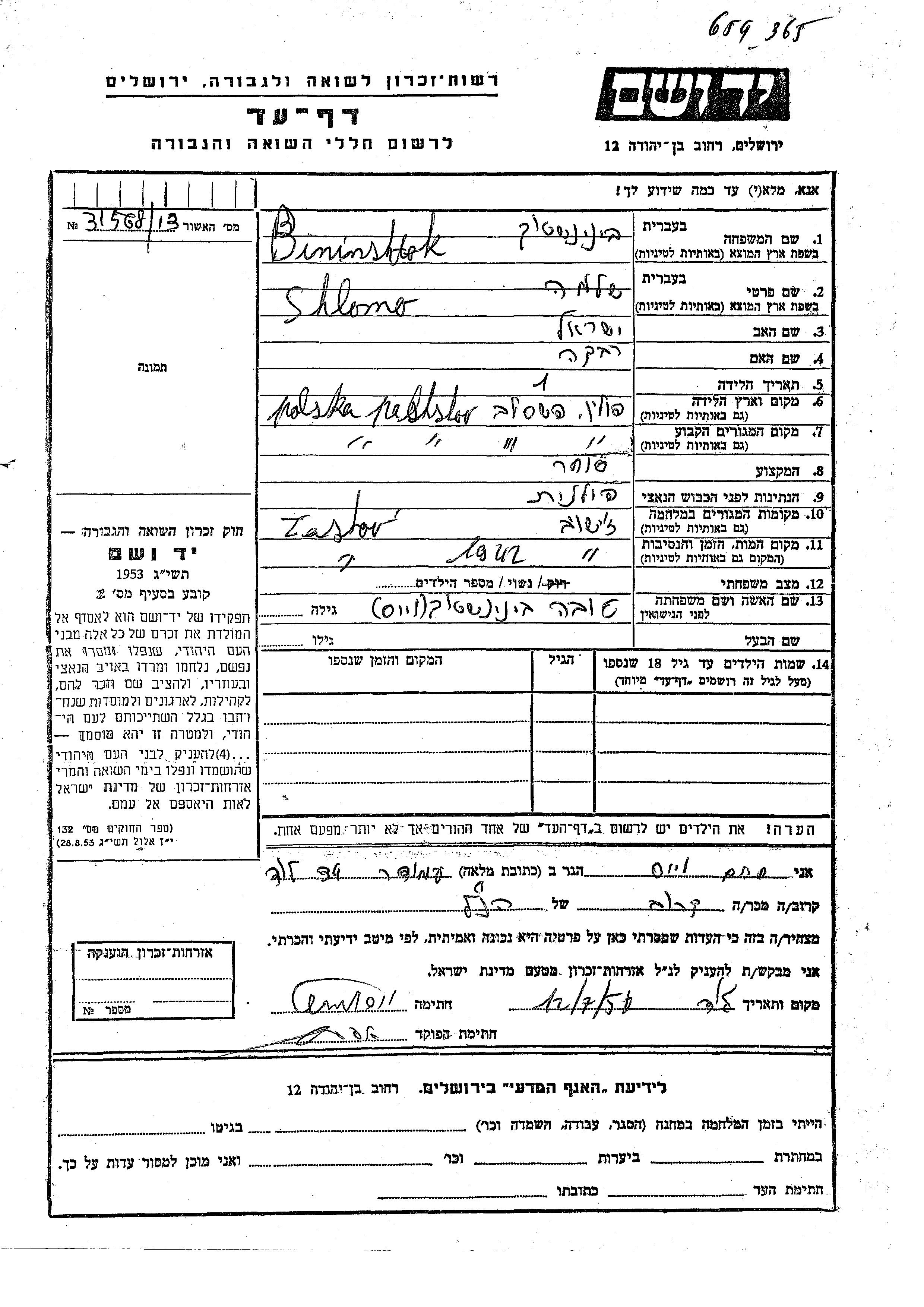Bininshtok Shlomo Przeclaw, Poland Page of Testimony