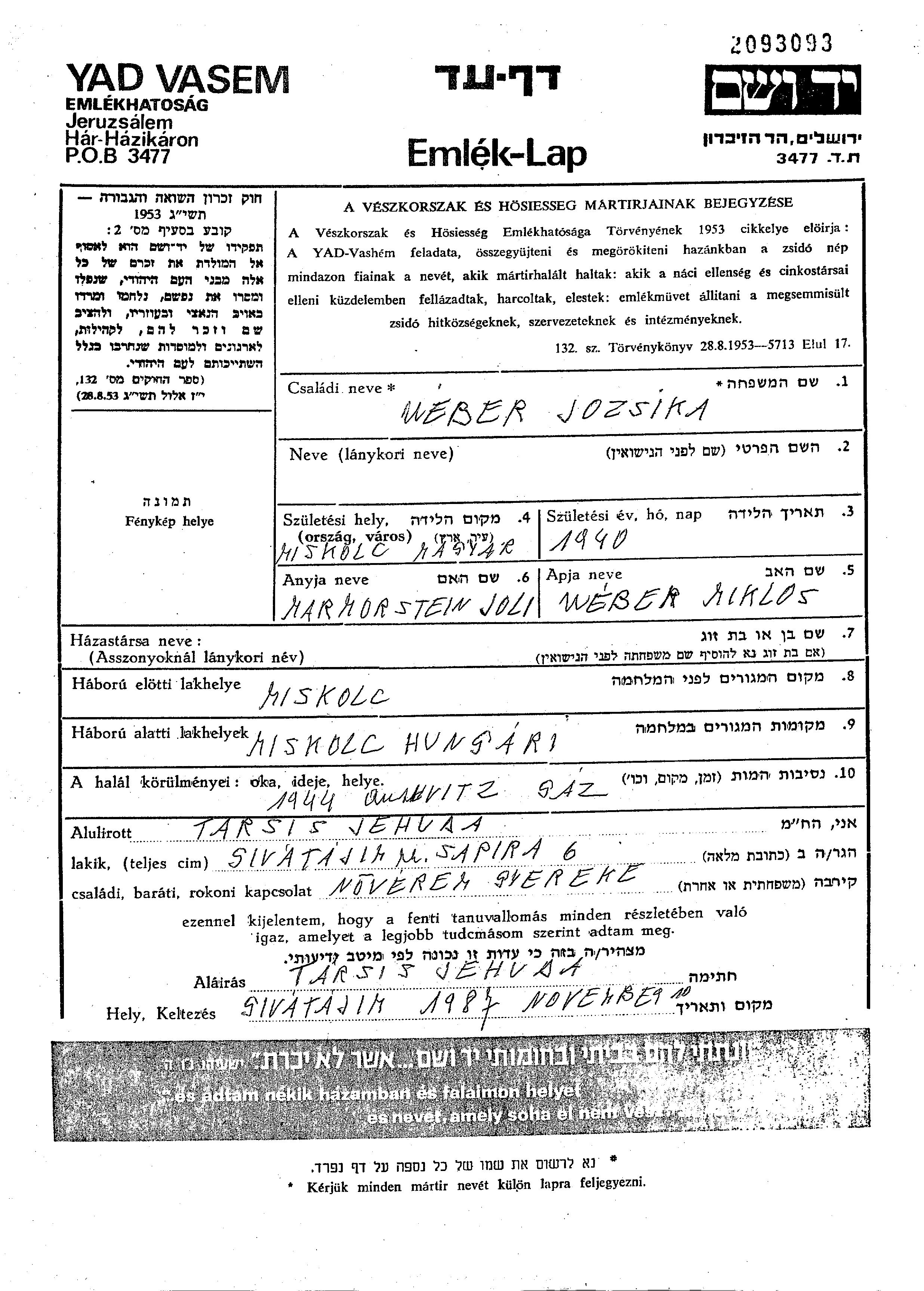 Weber Vaver Jozsika Miskolc, Hungary Page of Testimony