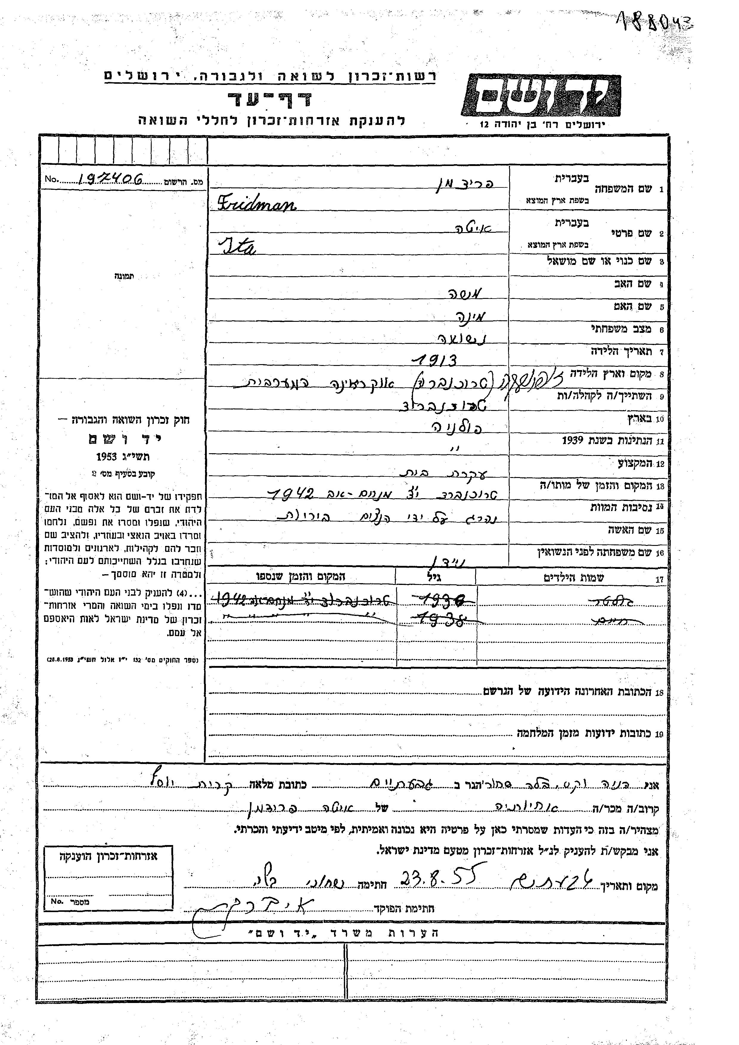 Ita Fridman nee Neiden was born in Zofjówka, Poland, 1913 to Moshe and Mina. She was a housewife and married. Prior to WWII she lived in Zofjówka, Poland. Ita was murdered in the Shoah. Place of death: Zofjówka, Poland, 1942.