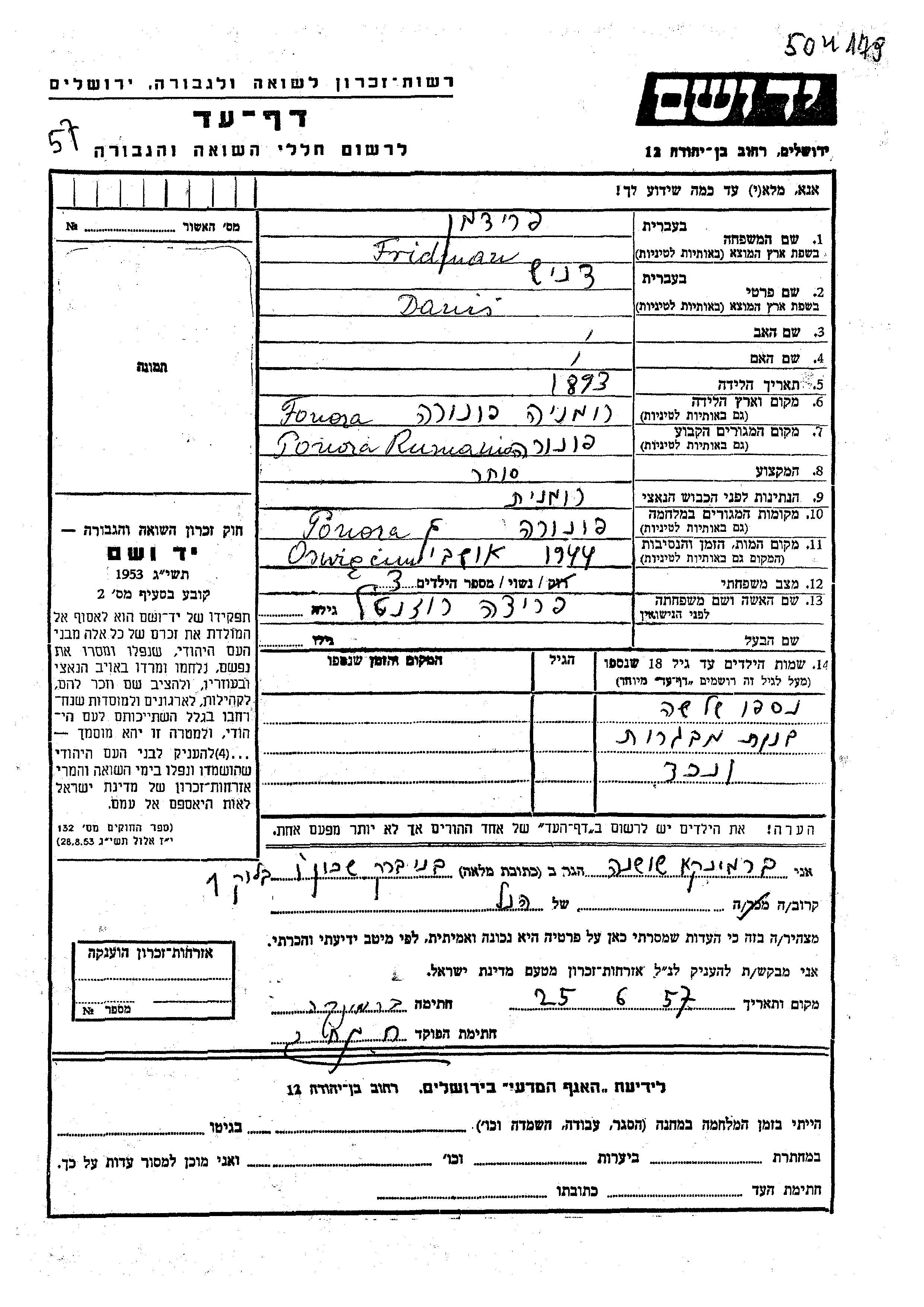 Fridman Danis Denish 1893 Ponor, Romania Page of Testimony