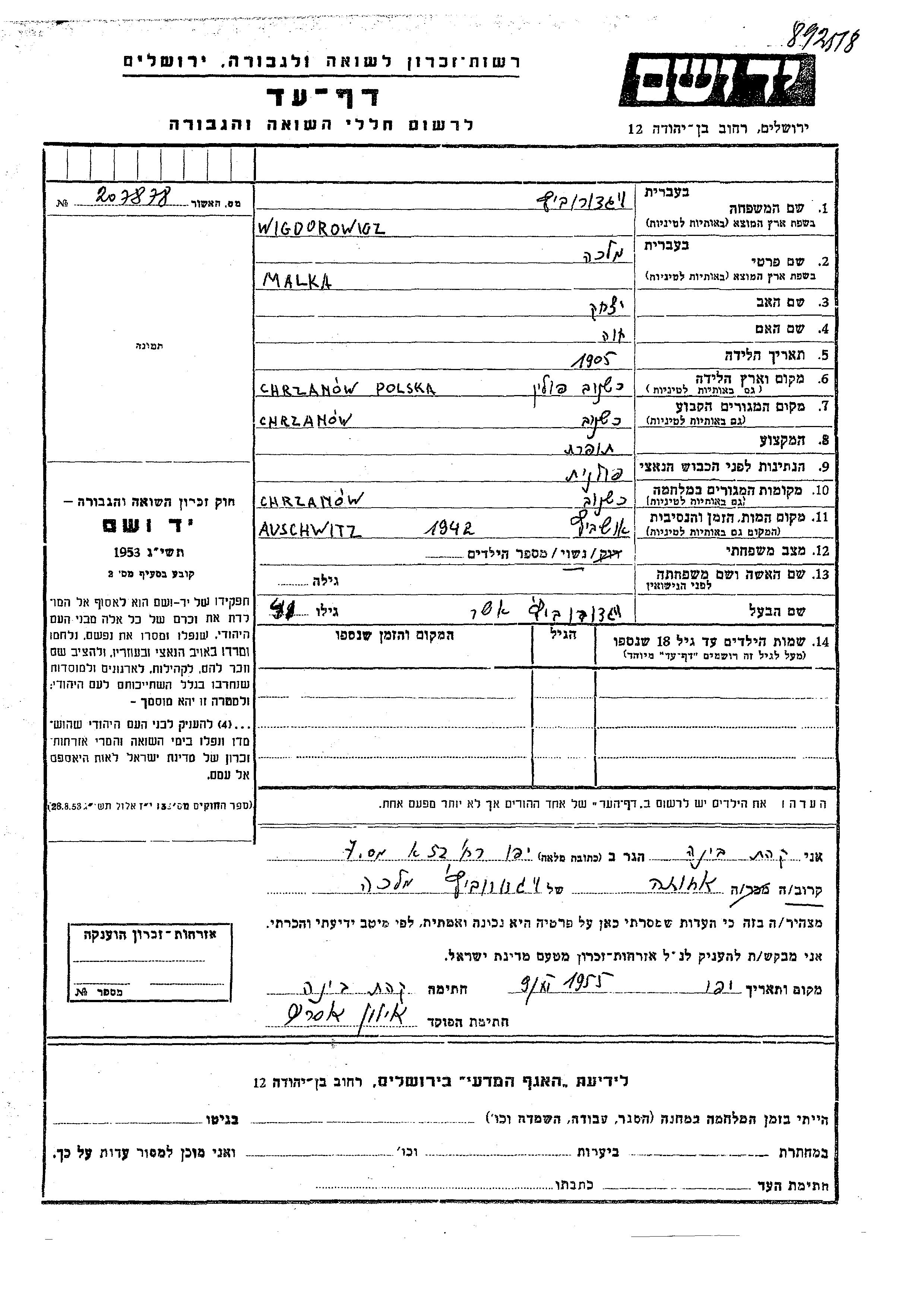 Wigdorowicz Malka 1905 Chrzanow, Poland Page of Testimony