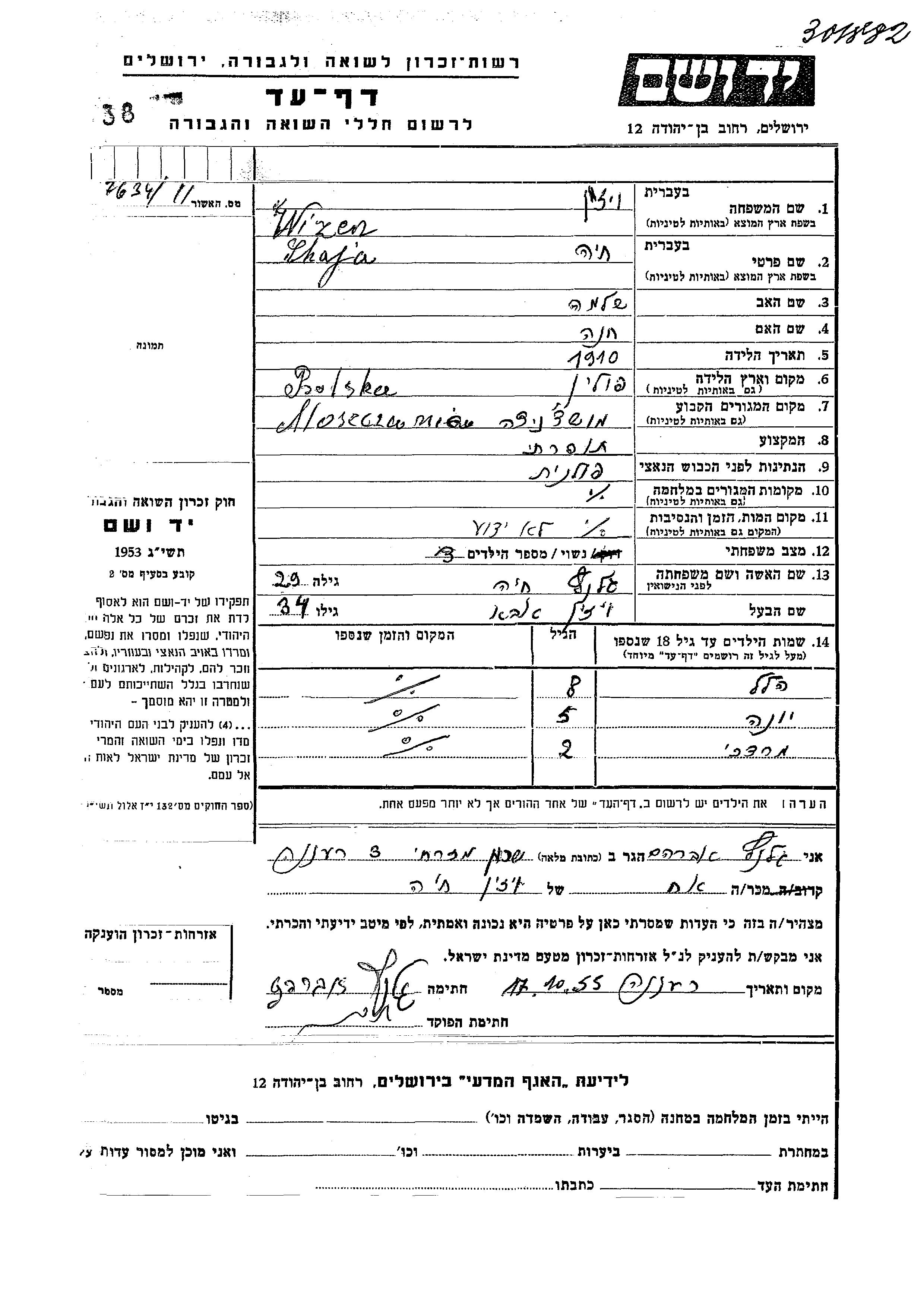 Chaja Wizen nee Glantz was born in Moszczenica, Poland, 1910 to Shlomo and Khana. She was a seamstress and married to Aba. Prior to WWII she lived in Moszczenica, Poland. Chaja was murdered in the Shoah.