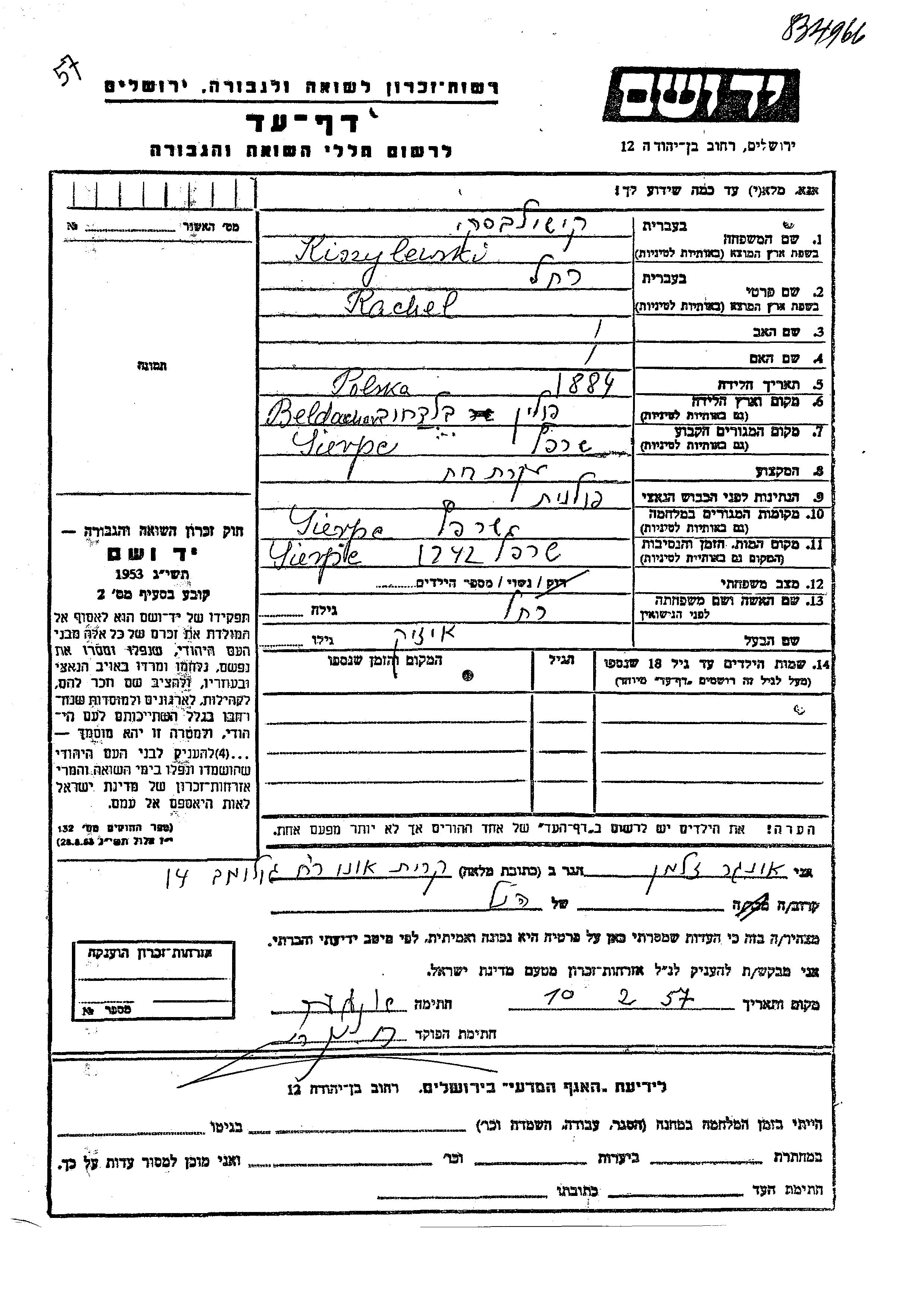 Rachel Kiszylewski was born in Beldachow, Poland, 1884. She was a housewife and married to Aizik. Prior to WWII she lived in Sierpc, Poland. During the war she was in Sierpc, Poland. Rachel was murdered in the Shoah. Place of death: Sierpc, Poland, 1942.