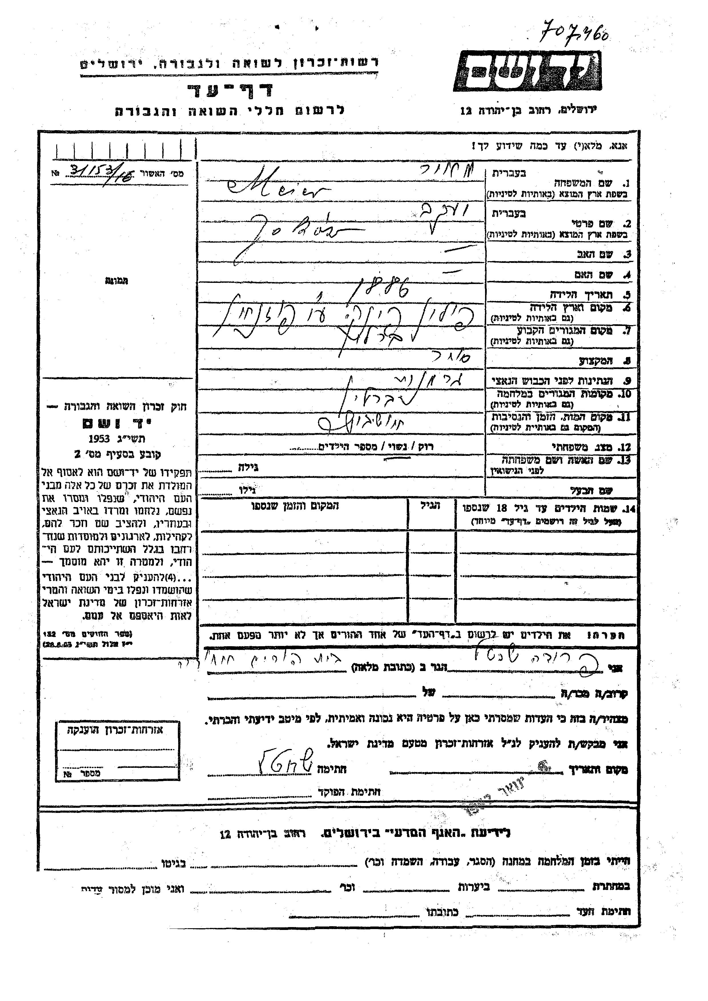 Jakow Meier was born in Pink, Poland, 1886. He was a merchant and married. Prior to WWII he lived in Berlin, Germany. During the war he was in Berlin, Germany. Jakow was murdered in the Shoah. Place of death: Auschwitz, Poland.