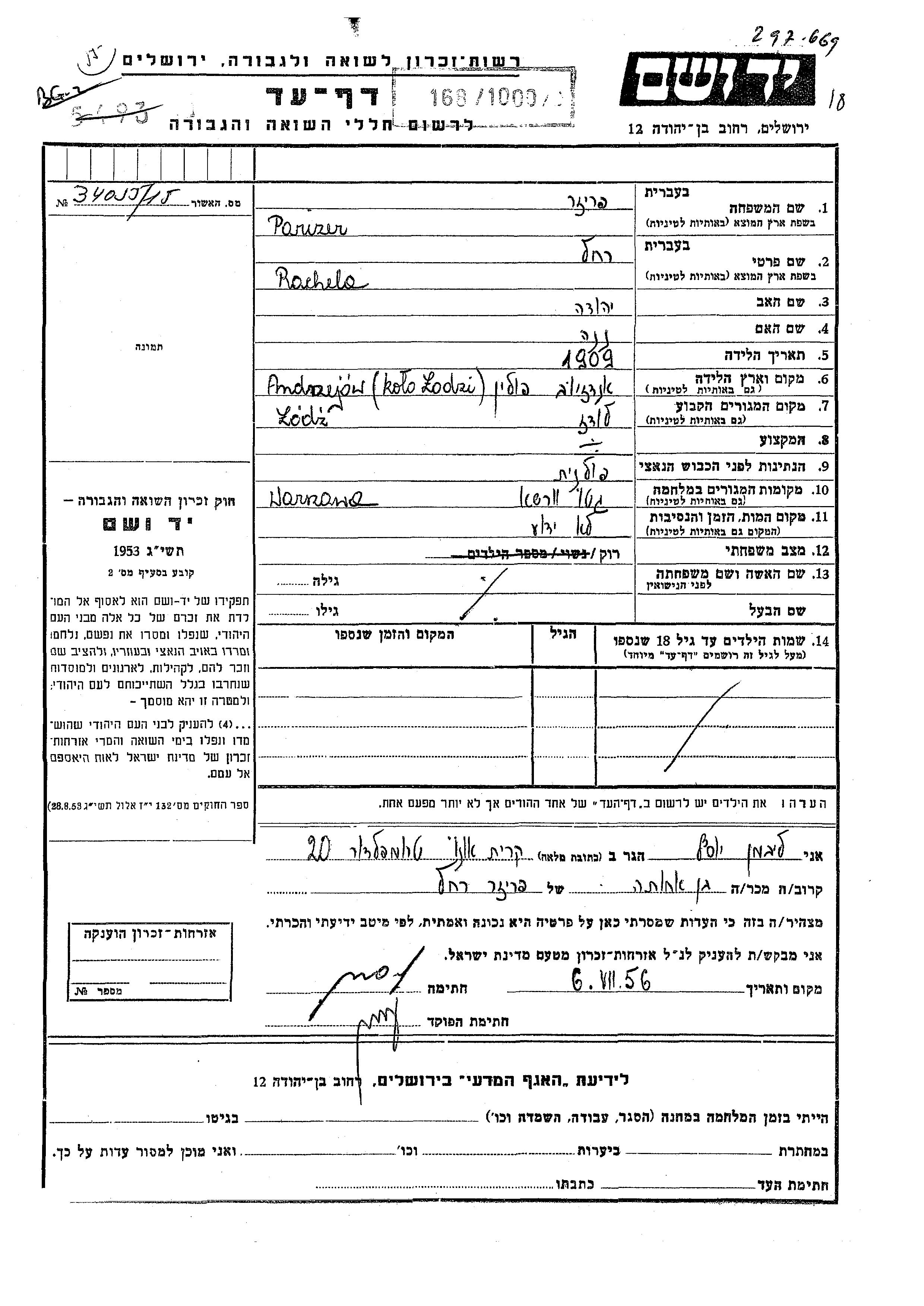 Rachela Parizer Rizer was born in Andrzejow, Poland, 1909 to Yehuda and Nena. She was single. Prior to WWII she lived in Lodz, Poland. During the war she was in Warsaw, Poland. Rachela was murdered in the Shoah.