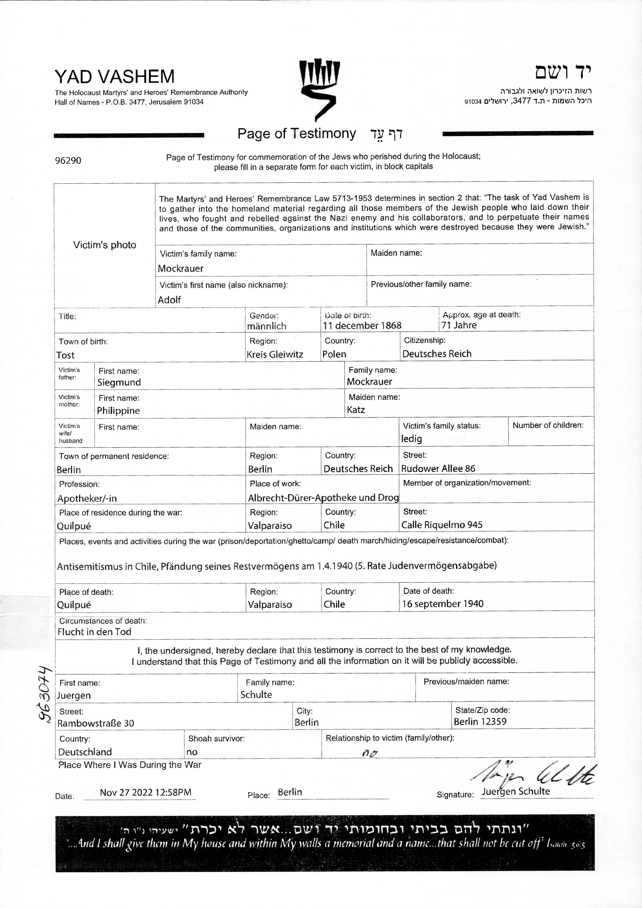 | Mockrauer | Adolf | 1868 | Berlin, Germany | Page of Testimony (digital signed) |