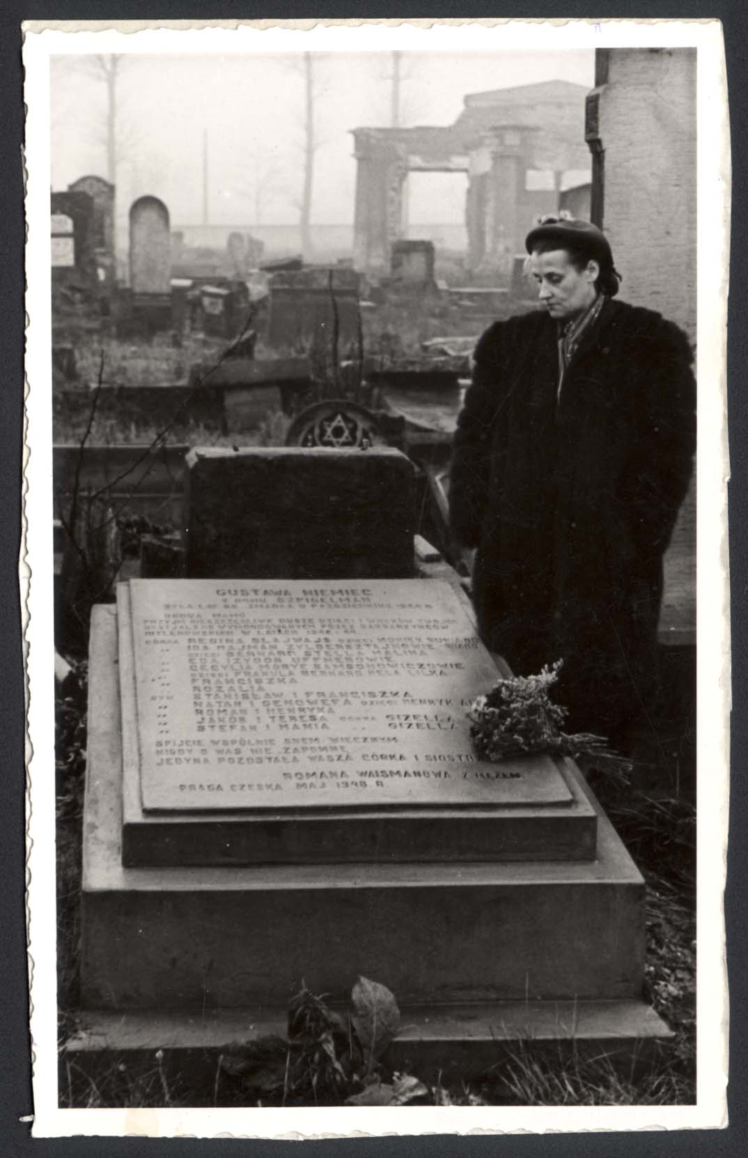 Czestochowa, Poland, Romana Weissman (nee Niemiec) standing beside a monumnet to her 11 siblings who persished in 1942 in the local Jewish cemetery.