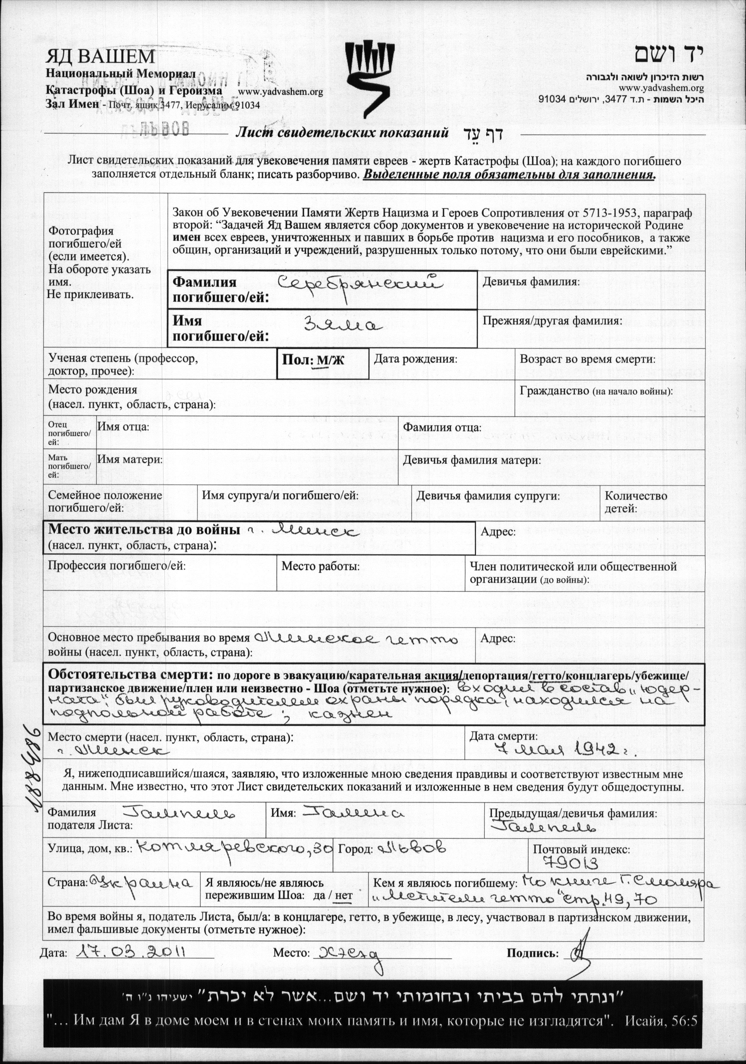 | Serebryanski | Ziama | unstated place, | Page of Testimony | |