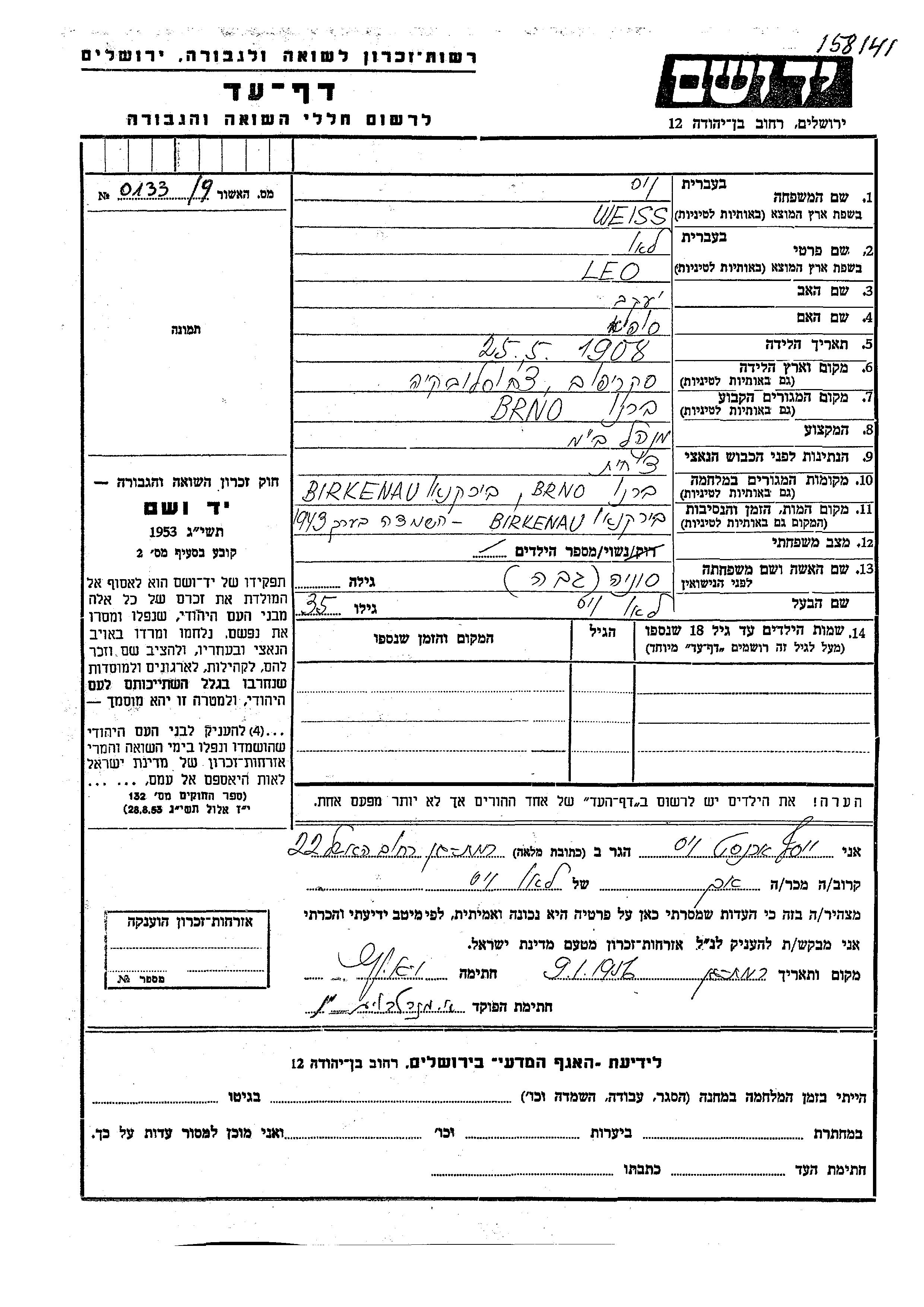 Weiss Leo 1908 Brno, Czechoslovakia Page of Testimony