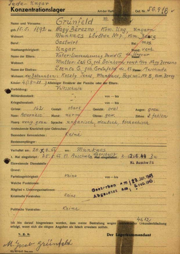 Grűnfeld M Jacob 1892 Munkacs, Czechoslovakia ITS card file