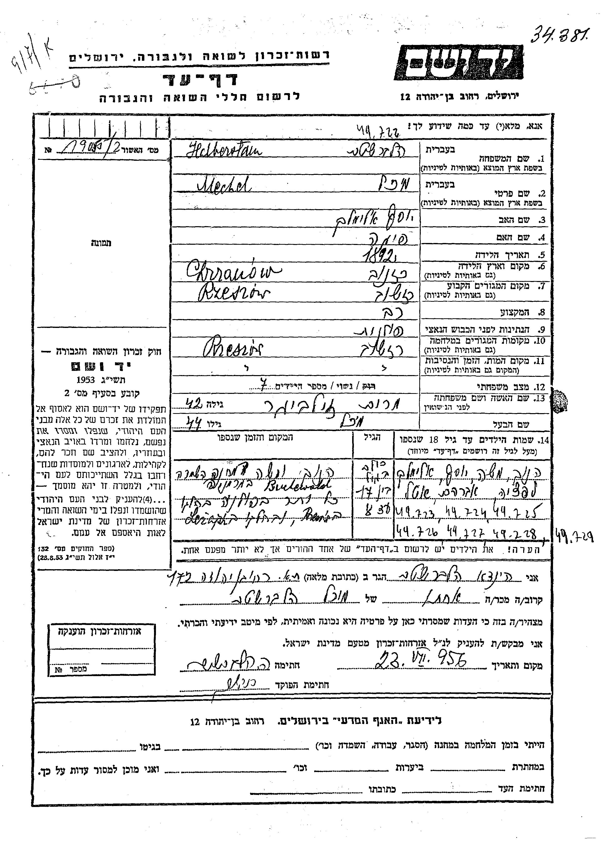 | Halbershtam | Mechel | 1892 | Rzeszow, Poland | Page of Testimony |