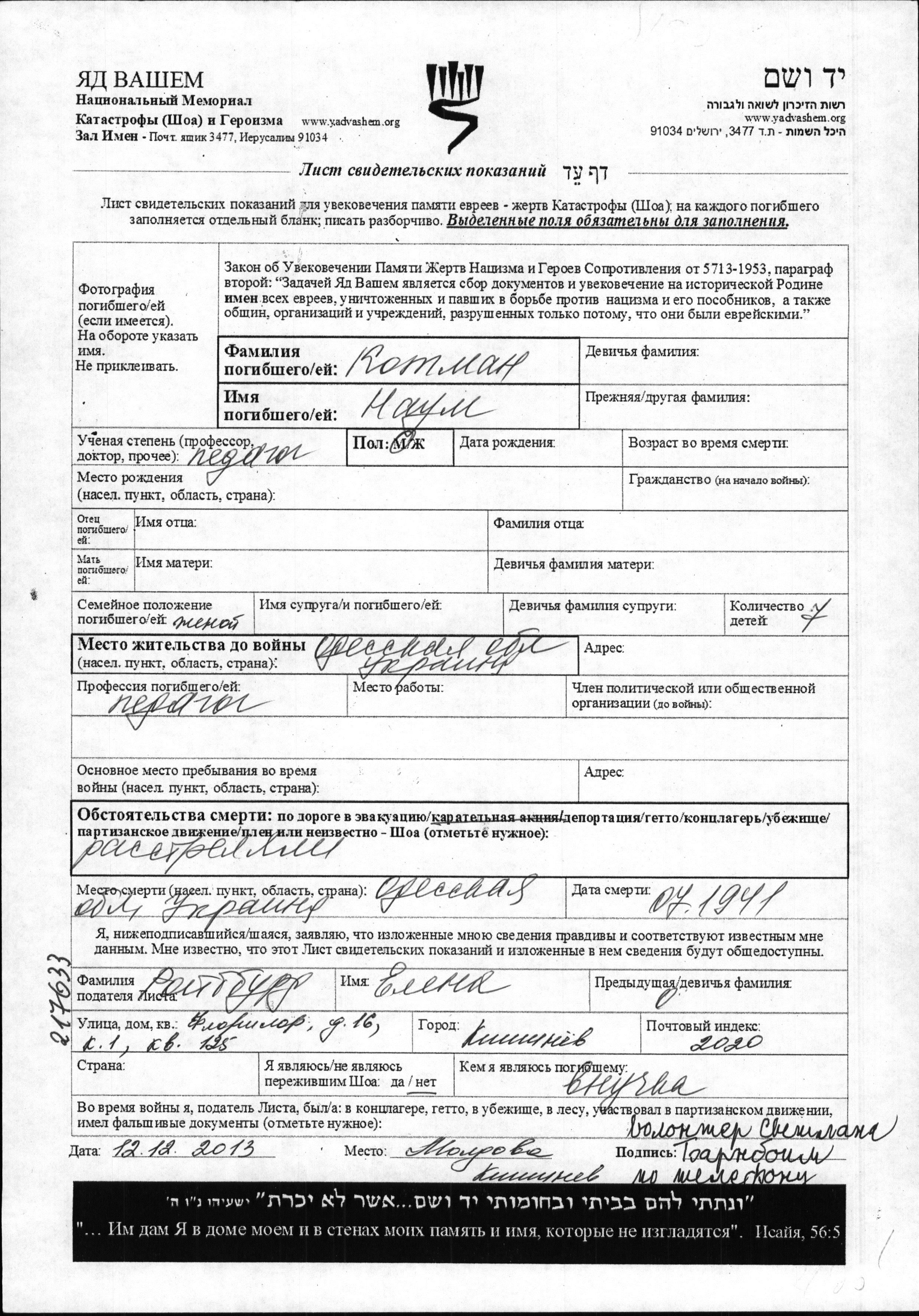 | Kotman | Naum | 1879 | Shemiotovo, Ukraine (USSR) | Page of Testimony |