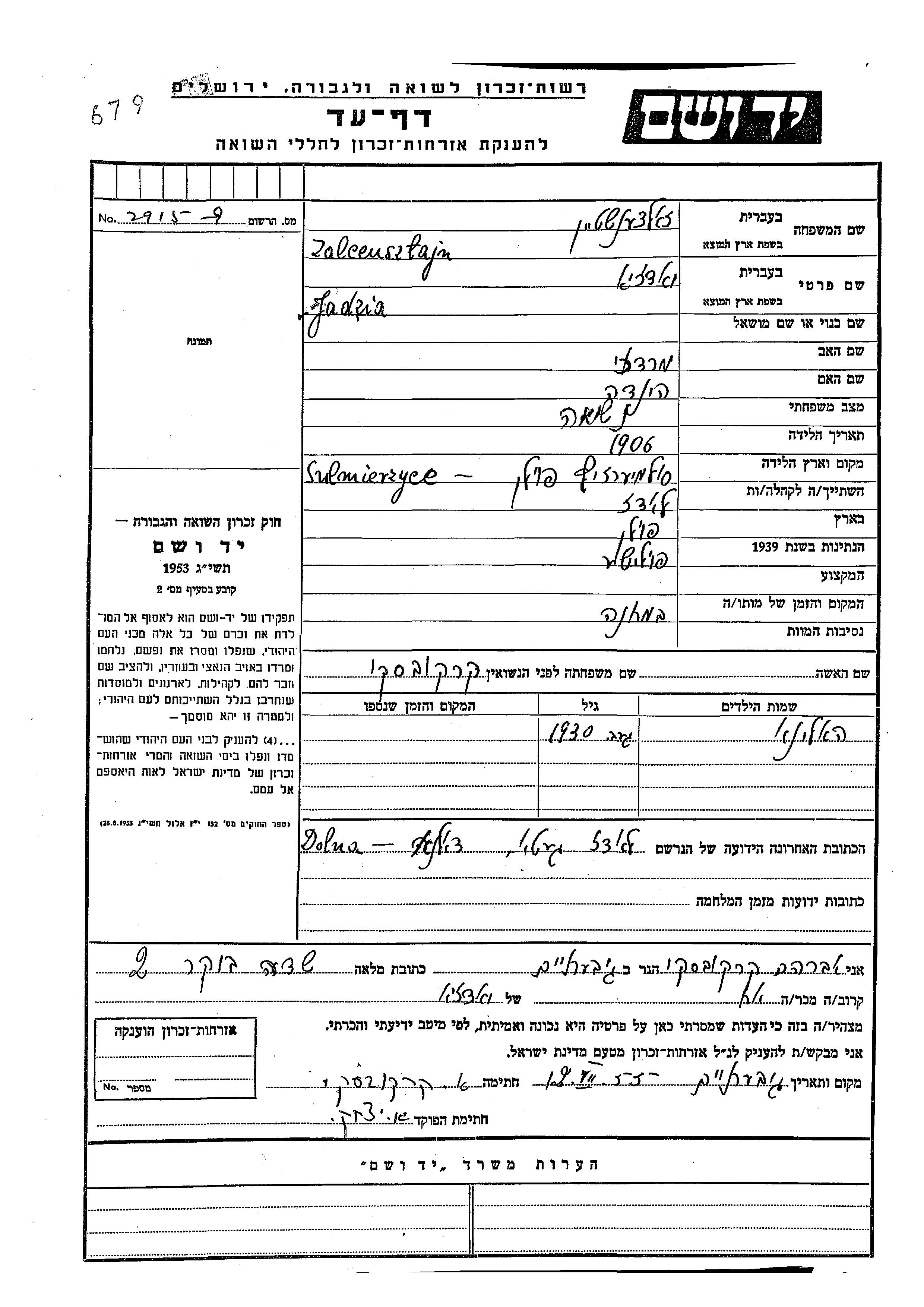 Zalcensztain Yadzia 1906 Lodz, Poland Page of Testimony