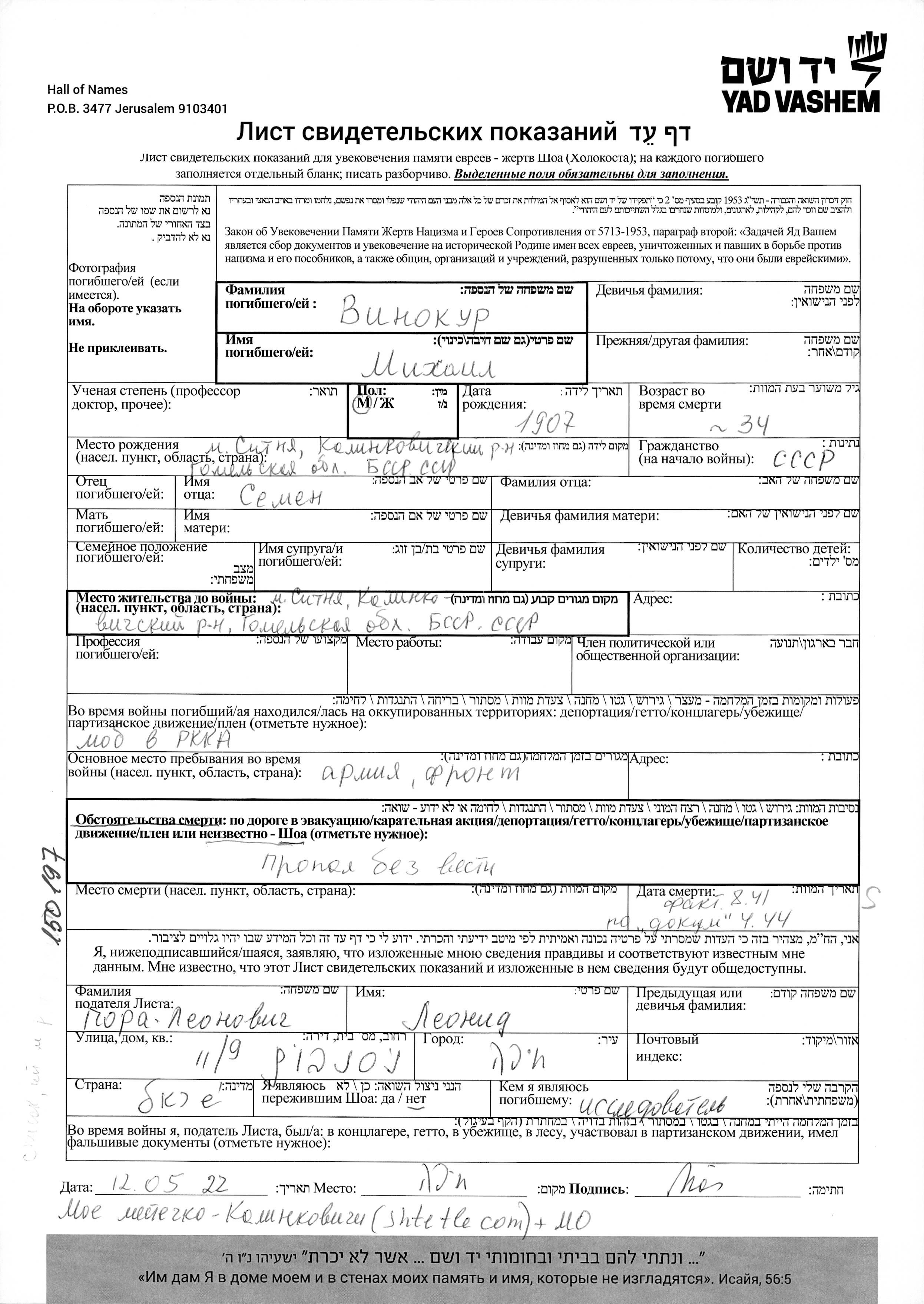 Mikhail Vinokur was born in Sitnya, Belorussia (USSR), 1907 to Semyon. Prior to WWII he lived in Sitnya, Belorussia (USSR). During the war he was in Sitnya, Belorussia (USSR). Mikhail was murdered in the Shoah. Place of death: Soviet Union, 08/1941.