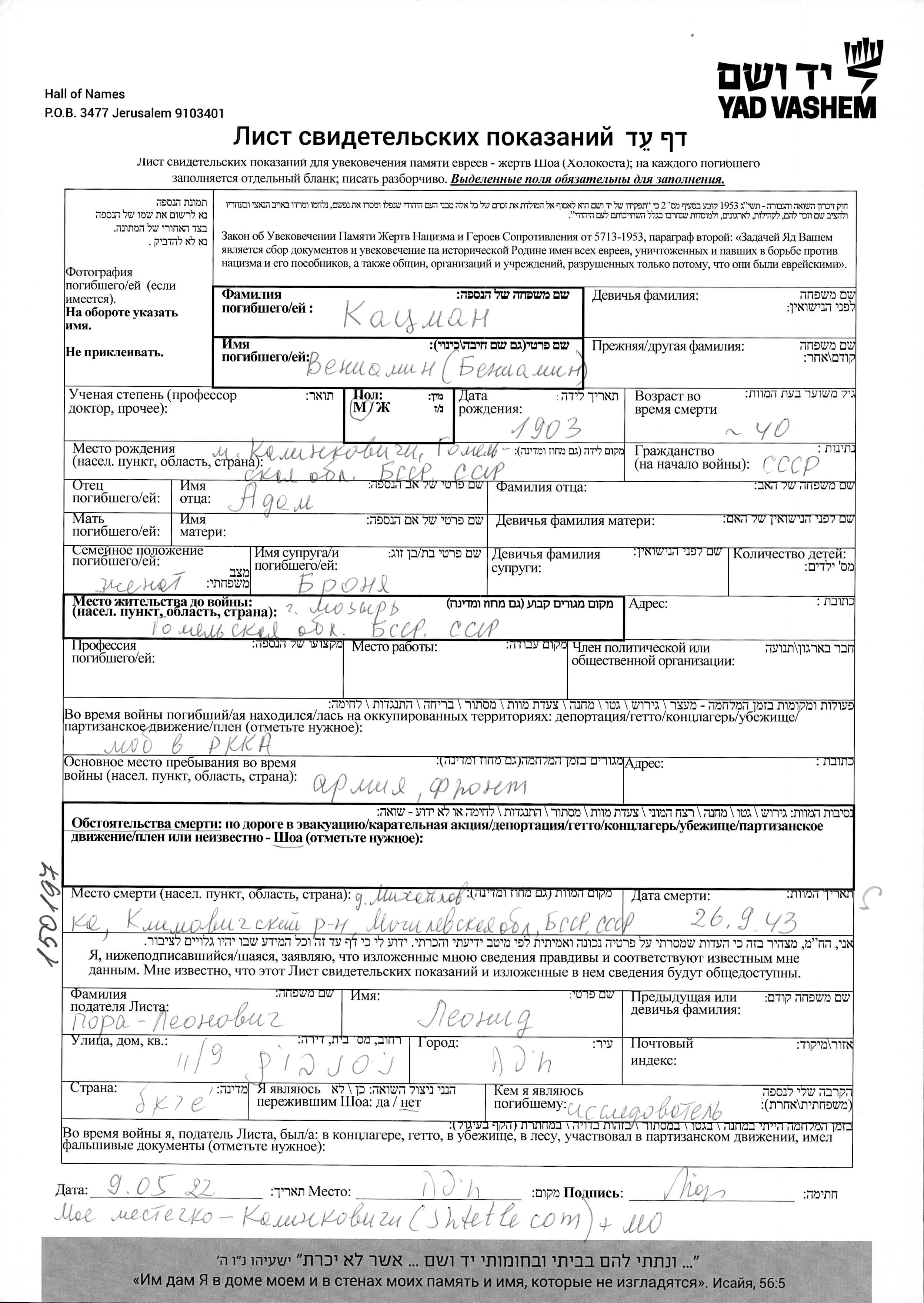 Veniamin Katzman was born in Kalinkovichi, Belorussia (USSR), 1903 to Adam. He was married to Bronya. Prior to WWII he lived in Mozyr, Belorussia (USSR). During the war he was in Mozyr, Belorussia (USSR). Veniamin was killed in military service in WWII. Place of death: Klimovichi, Belorussia (USSR), 26/09/1943.