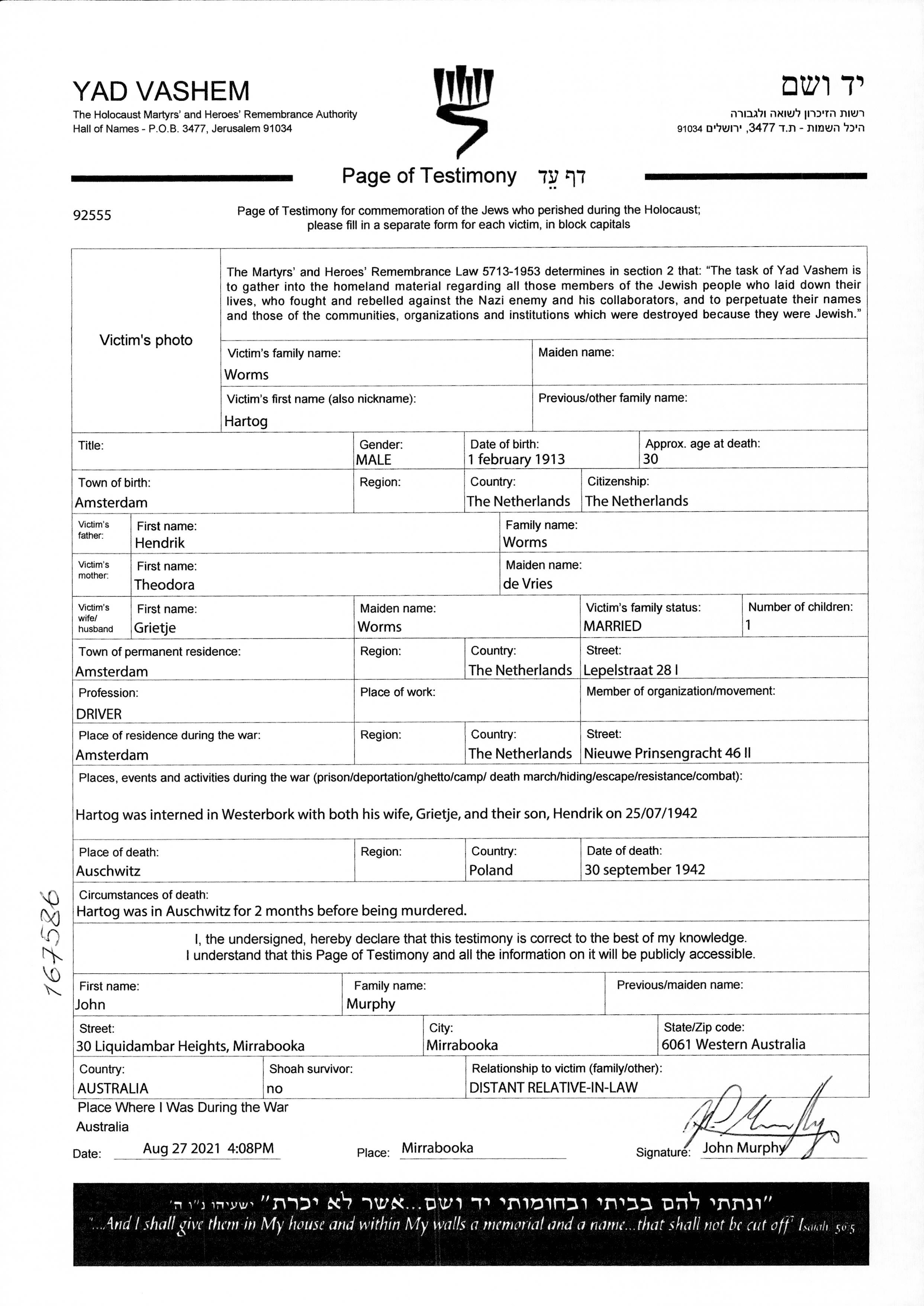 Worms Hartog 1913 Amsterdam, The Netherlands Page of Testimony (digital signed)